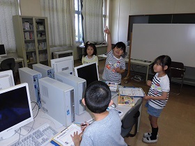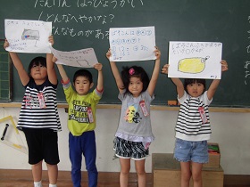 探検発表会では、クイズなどを通して部屋で見つけた物を発表しました。自分が行かなかった部屋の発表に、「へぇ、そうなんだ。」「そんなに多いの?」「OOさん、はきはきして聞きやすい。」など、いろんなつぶやきが聞かれていました。 |
