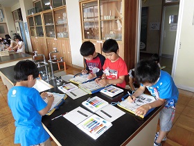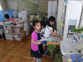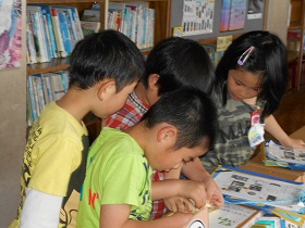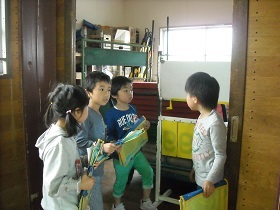 もっとよく知りたいと思った部屋を、グループごとに探検しました。今回のミッションは、教室にない物を見つけてカードに書くこと。3個が目当てでしたが、それ以上頑張った子どもがほとんどでした。 |