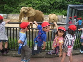 動物の所で行くたび「カピパラー!」「レッサーパンダー!」と、名前を連呼していた子どもたちでしたが、オオカミの所だけは「ウォ〜ン」「ワォ〜ン」と、遠吠え???。ゾウの所では「昨日どろんこ遊びをしたのかな。体にたくさん土がついているね。」と話していました。「餌やりの窓に指を付けていたら、ゾウが鼻でさわってきた!」と興奮しながら話す子どもがいて、みんなにうらやましがられていました。 |
