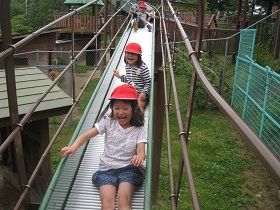 楽しみにしていたアソヴェの森には大歓声が響きました。やっぱり人気は長いすべり台。「4回目!」などと叫びながら、手を振りながらゴロゴロ進んでいきました。ルールを守りながら、大汗をかいてたっぷり遊び、みんな大満足でした。 |