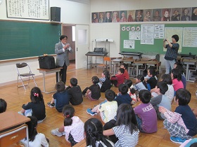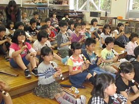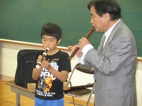 リコーダー講習では、タンギングの仕方を学びました。「トゥトゥトゥ」と舌で一音ずつ歯切れよく演奏するコツを学び、子どもたちのリコーダーの音色がどんどんきれいな音になっていきました。 |