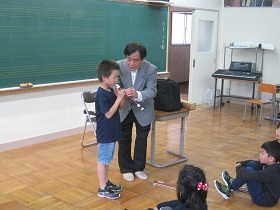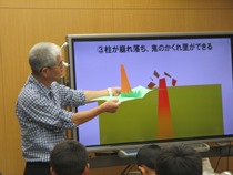 ジオパーク学習を行いました。ジオパークの意味や男鹿は大昔に噴火があったことなどについて、わかりやすく説明していただきました。 |