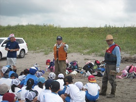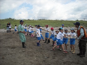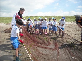 船越浜で地引き網を体験しました。地域の方々に、漁の仕方などを指導していただきました。雨で一度延期になり、夏休み直前の活動となりましたが、網にはたくさんの魚がかかり、みんな大喜びの体験となりました。 |