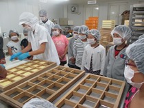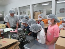 社会科の学習で、船越にある八郎めんを見学しました。大きな機械を使って粉から麺になる過程を見せていただきました。袋詰めの工程では、実際に子ども達が台紙に麺とスープを並べ、機械で袋詰めを行いました。 |