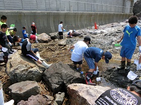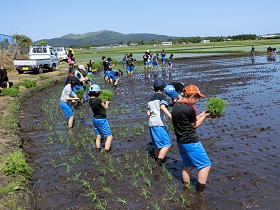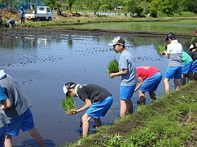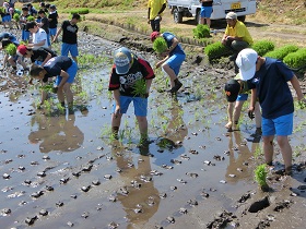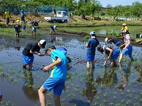 総合的な学習の時間にJAの方々のご協力で,田植えを行いました。 |