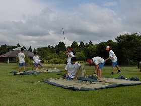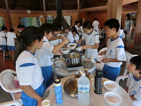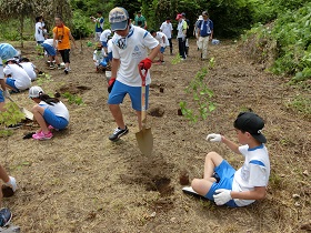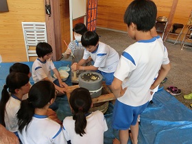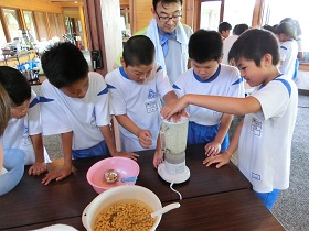 はじめに海水を使った島豆腐作りを体験しました。石臼の重さに驚きながらも大豆を細かくすることができました。また,植樹体験では,20年後にドングリができることを願って植えました。 |