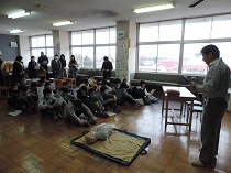 男鹿地区消防署から2名の講師を迎え、救急救命講習を行いました。いざという時のために体験を通して、命を守る大切さを理解し、実践しようという意識が高まりました。 |