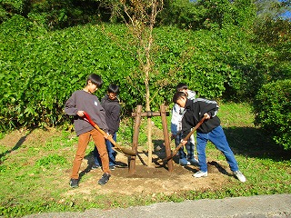 創立150周年の記念に「さるすべり」の木を二本植えました。6年生が代表で植えました。百日近く咲き続け、開花期間が非常に長いことから、家運の長期的な繁栄や長寿を象徴すると言われています。花が咲くのが楽しみです。