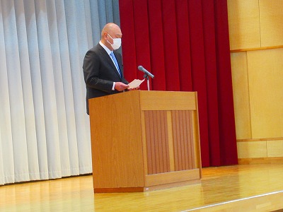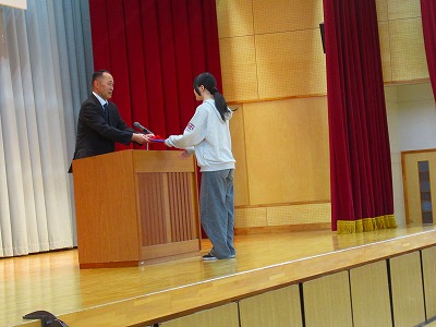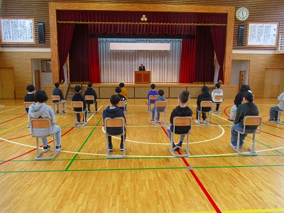 三浦同窓会会長と奥山PTA会長をお迎えして、もうすぐ卒業する6年生が、同窓会入会式を行いました。同窓会についてのお話を聞いたり、記念品をいただいたりしました。同窓会からはマグカップ、PTAからは図書カード、男鹿市からは卒業証書フォルダーをいただきました。卒業生を代表して、目黒さんが誓いの言葉を述べました。卒業式は金曜日です。