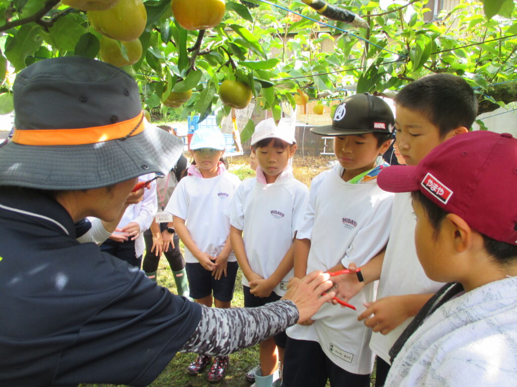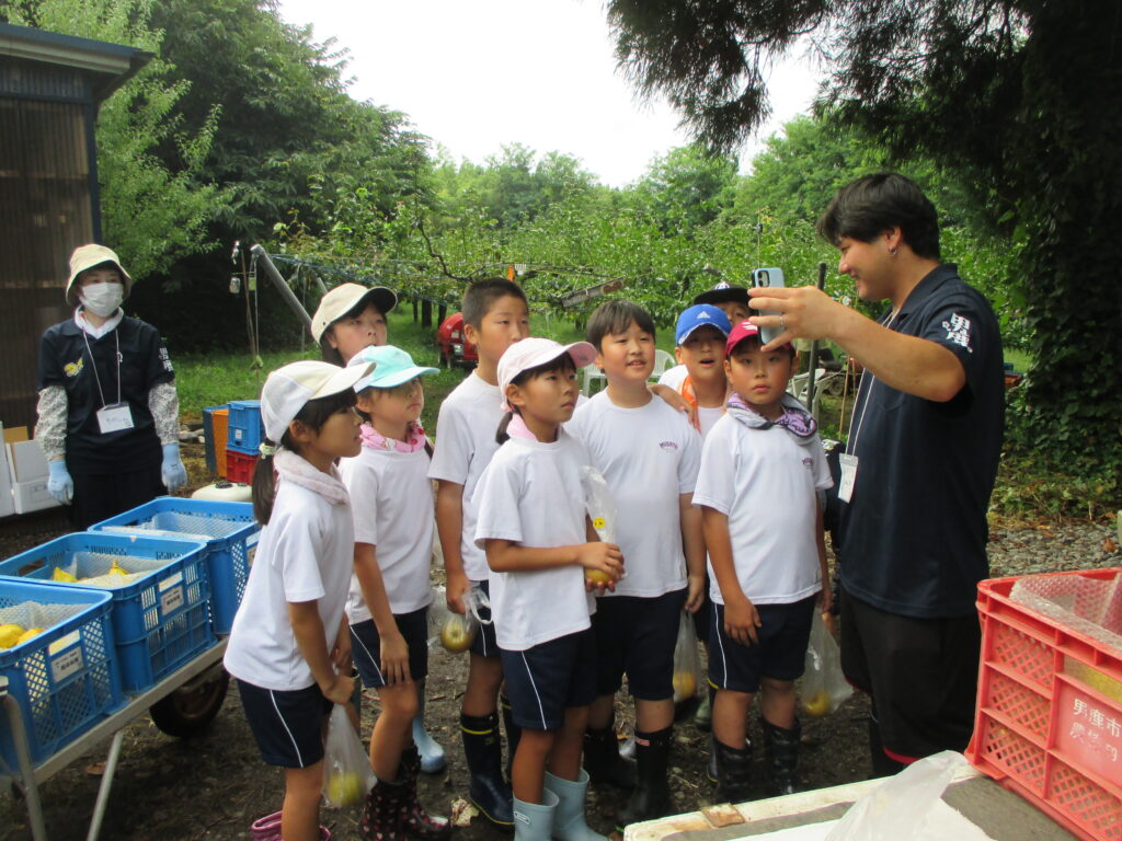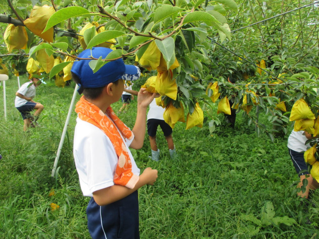 9月11日に、3年生が藤原農園で男鹿梨の収穫体験を行いました。この梨は、5月に受粉させた梨です。これまで受粉、摘果、収穫といった活動を通して、たくさんのことを学ばせていただきました。藤原農園の皆さん,1年間お世話になりました。