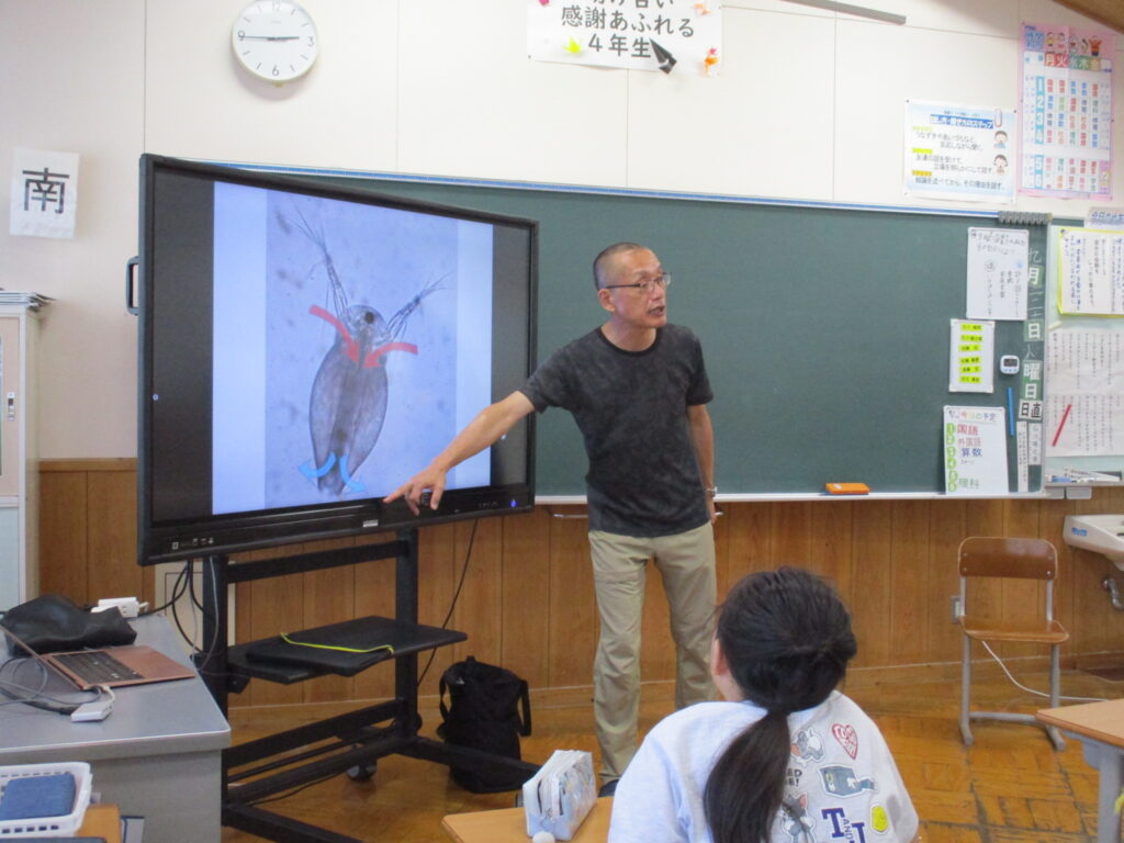 9月30日、千葉県立中央博物館の林紀男先生をお招きして、環八郎湖環境学習出前授業を行いました。この学習は、子どもたちに八郎湖の自然と歴史を伝えようと、特定非活動法人「はちろうプロジェクト」が計画したものです。水草の種類が紹介された後に、八郎潟が干拓されて沈水植物が絶滅してしまったこと、食物連鎖や食物網など、生き物同士のつながりについて学びました。