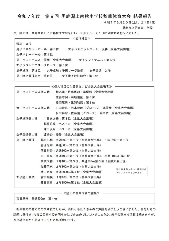 2025年09月21日(日) 9月20日(土)と21日(日)に、男鹿潟上南秋秋季大会が各地で開催されました。新体制となって最初の公式戦でしたが、1・2年生は懸命に頑張りました。下の図をクリックすると結果を見ることができます。