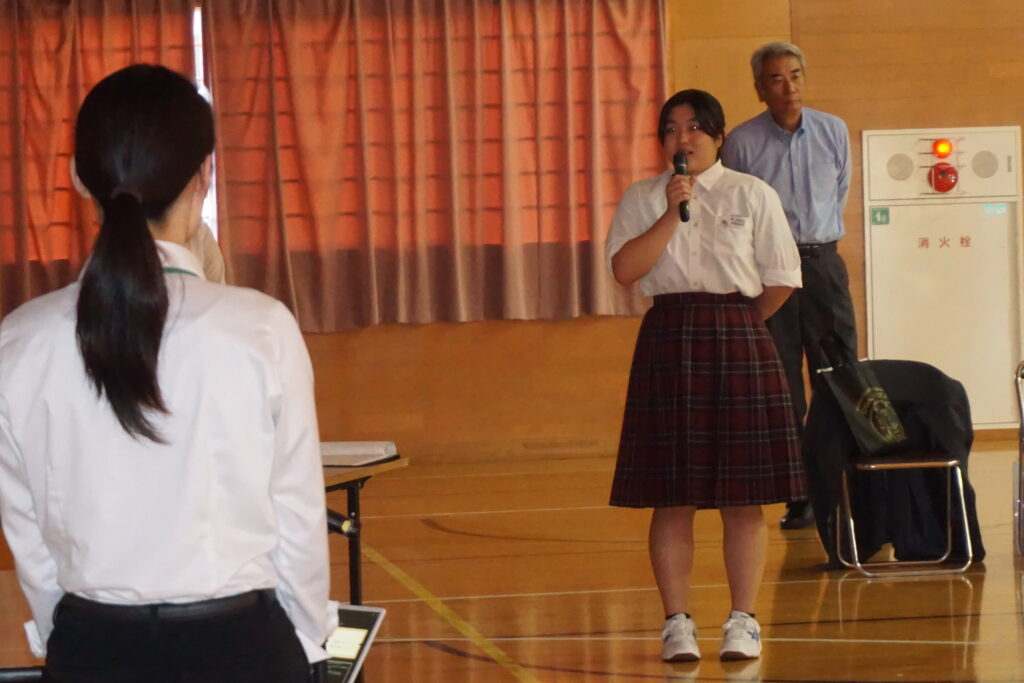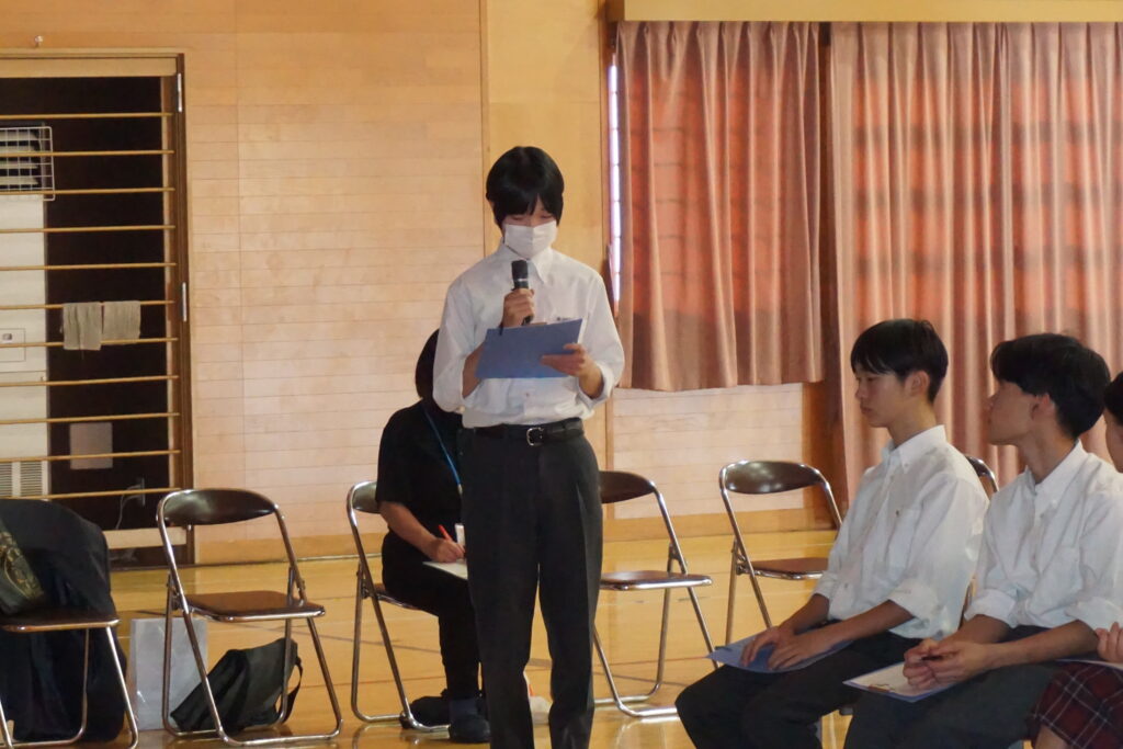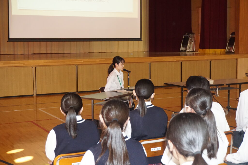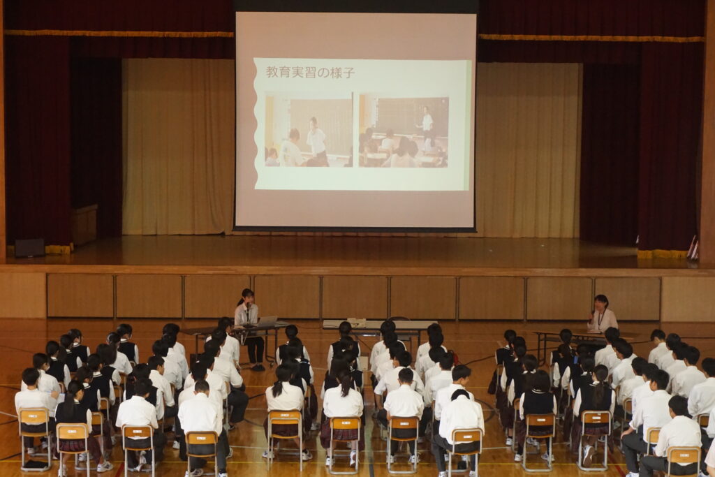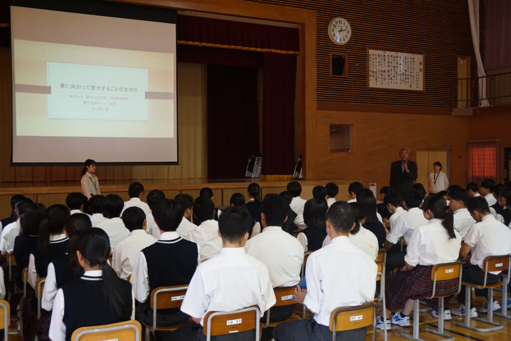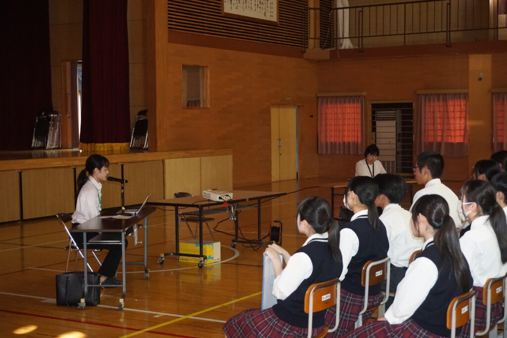 「夢の実現に向けて努力している男鹿市出身の秋田大学生を講師として招聘し、市内各中学校の3年生を主対象に講演会を実施することにより、生徒たちの学習意欲を喚起するとともに、将来の自分の姿を見据えた学校生活を送ることができるようにする。」という目的で、男鹿市教育委員会主催の学習講演会が、10月3日(金)に本校で開催されました。