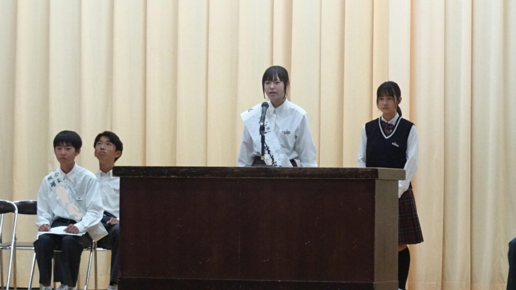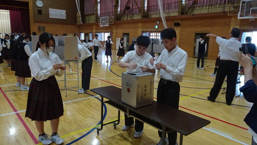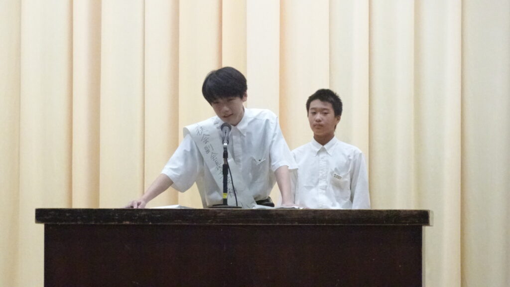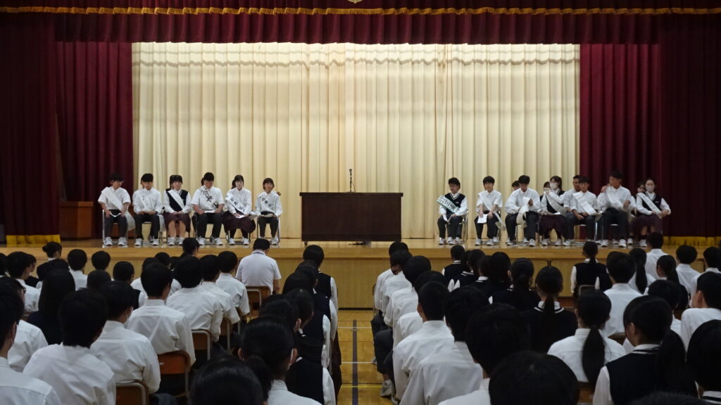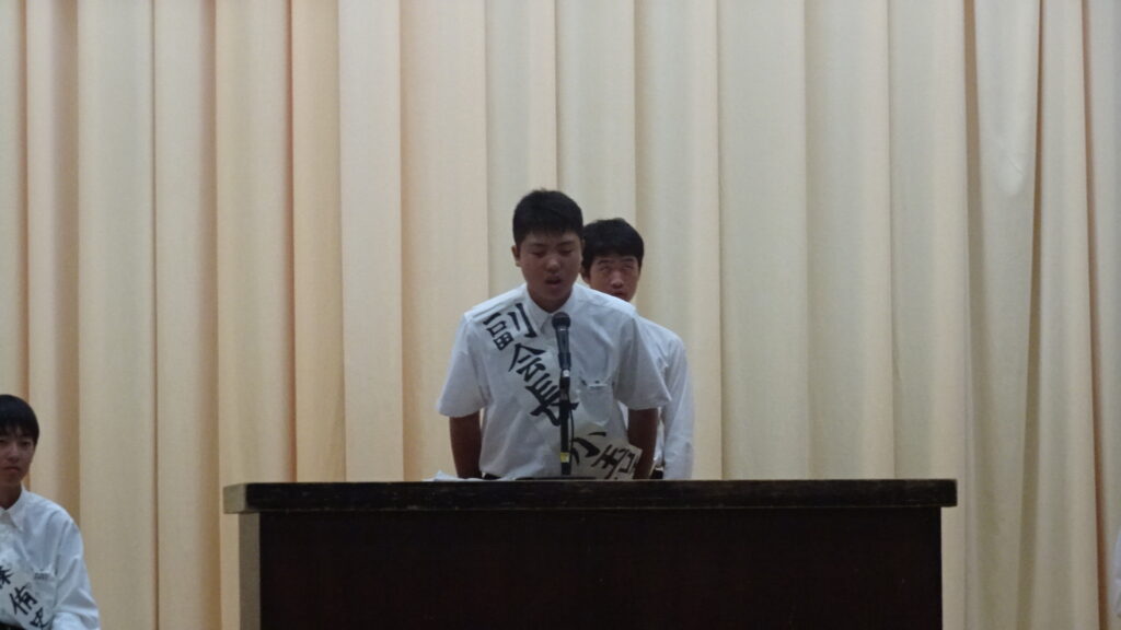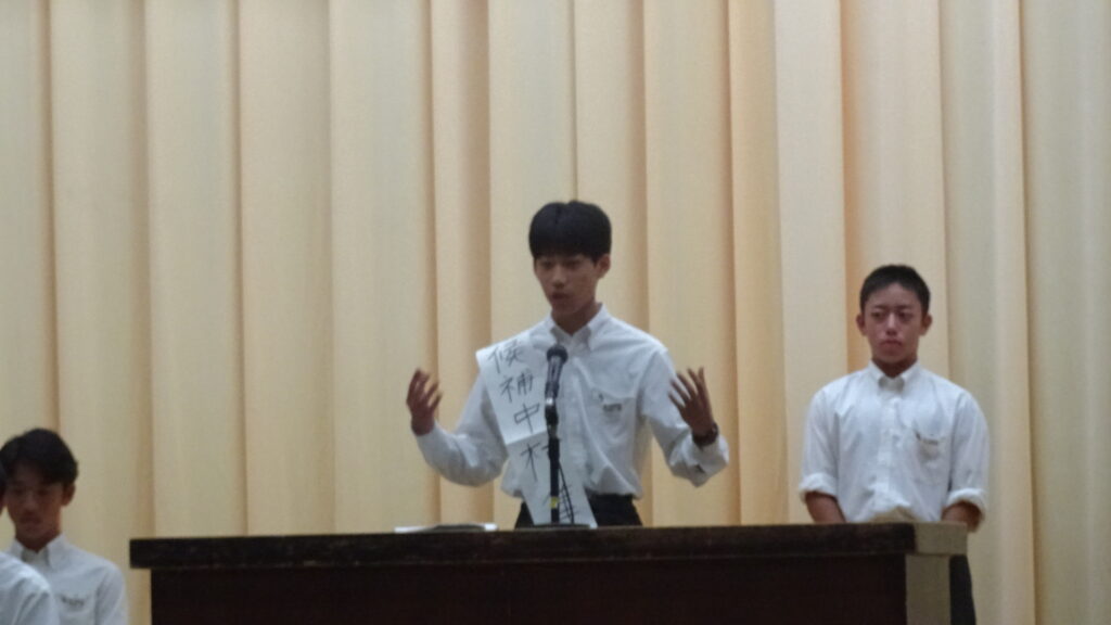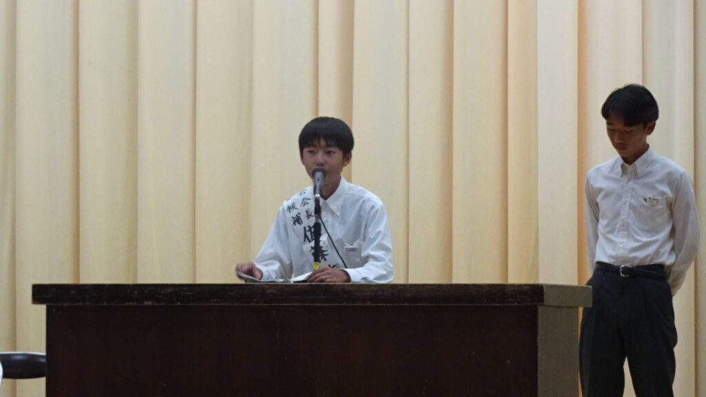 10月6日(月)、後期生徒会役員を決める選挙がありました。選挙管理委員長あいさつ、校長あいさつ、立ち会い演説会(責任者による応援演説+立候補者による演説)、投票と、整然と進められました。投票箱も用意され、実社会とほぼ同じ仕組みで役員が選出されました。1・2年生が学校の中心となり、新しい風を吹かせてくれることを期待しています。