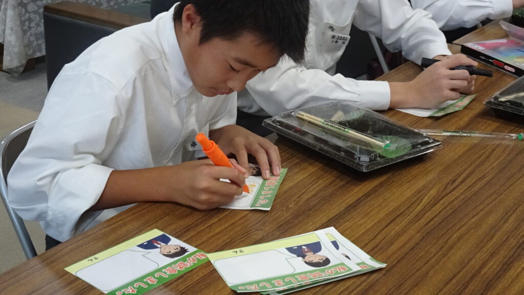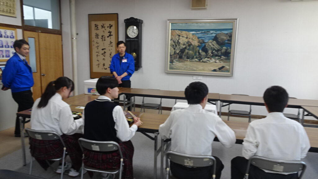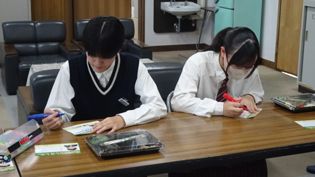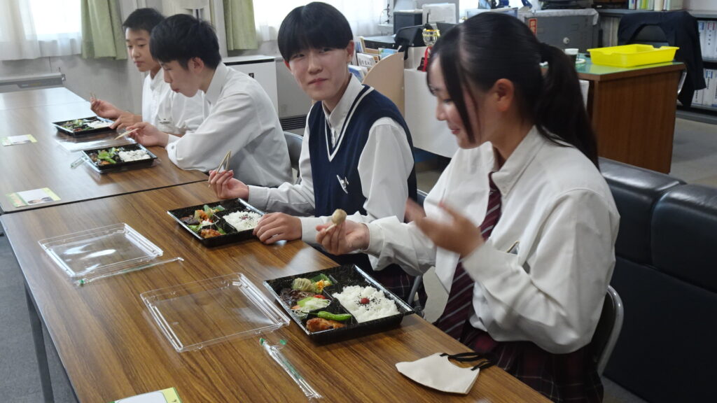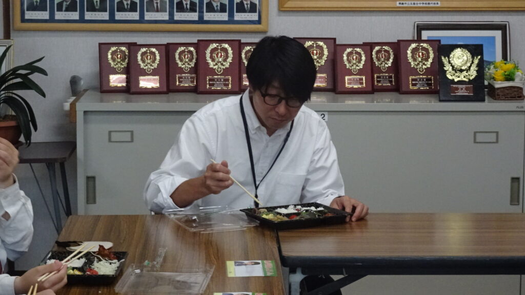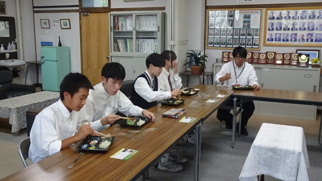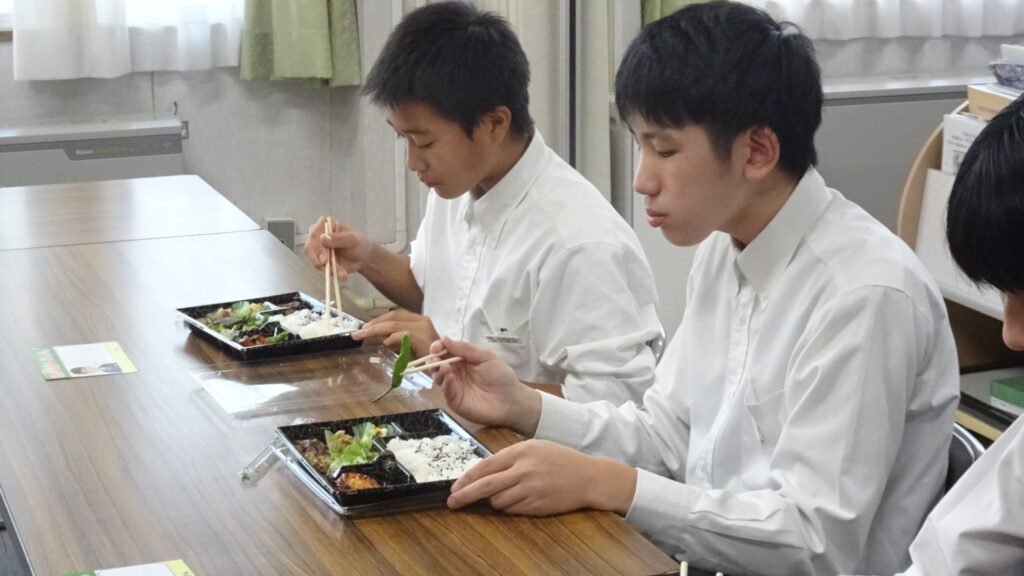 10月15日(水)、2年B組が考案した10月販売用アマノとのコラボ弁当を試食しました。2Bに与えられたお題は、10月の旬である「新米、鶏手羽肉、秋鮭、さといも、大根」でした。10月の店頭販売は10月16日(木)から26日(日)です。16日と17日の2年生職場体験に合わせて、早めに販売してくださることになりました。17日(金)には、アマノで職場体験中の2年生が、11時から12時頃の間に実際に店頭で販売を体験する予定です。よろしければアマノに足を運んでくださればと思います。