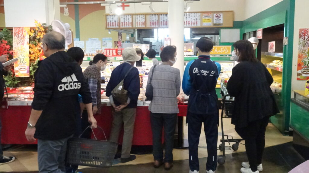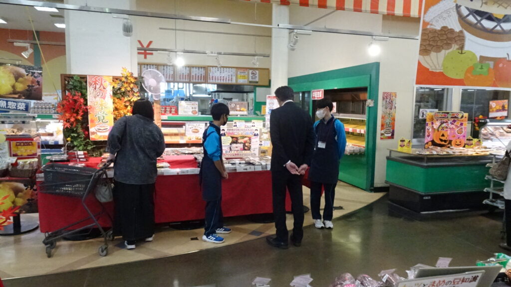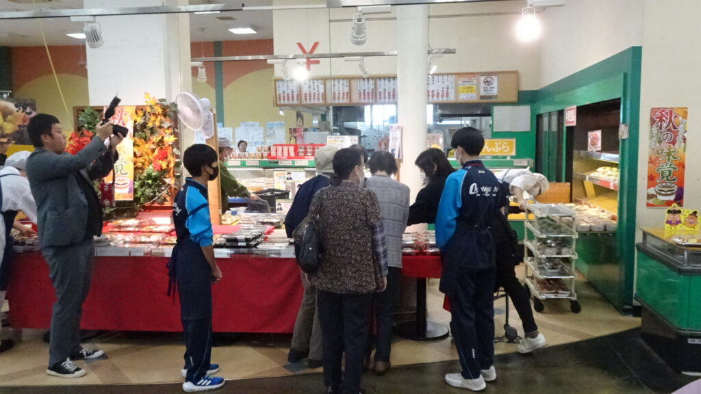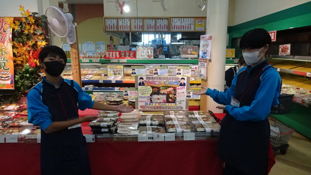 10月17日(金)、この日は2年生の職場体験の2日目でした。スーパーセンターアマノで体験中の2年生が、B組が考案した10月コラボ弁当を、「男鹿東中でつくった弁当です。」「いかがですか。」と宣伝しながら販売しました。店内放送で「男鹿東中学校2年生が来て、自分たちが考案した弁当を販売しています。」と伝えたところお客様が増え、昼前の段階で見事完売しました。2B考案の10月弁当は26日(日)まで販売しますので、よろしければ食べてみてください。