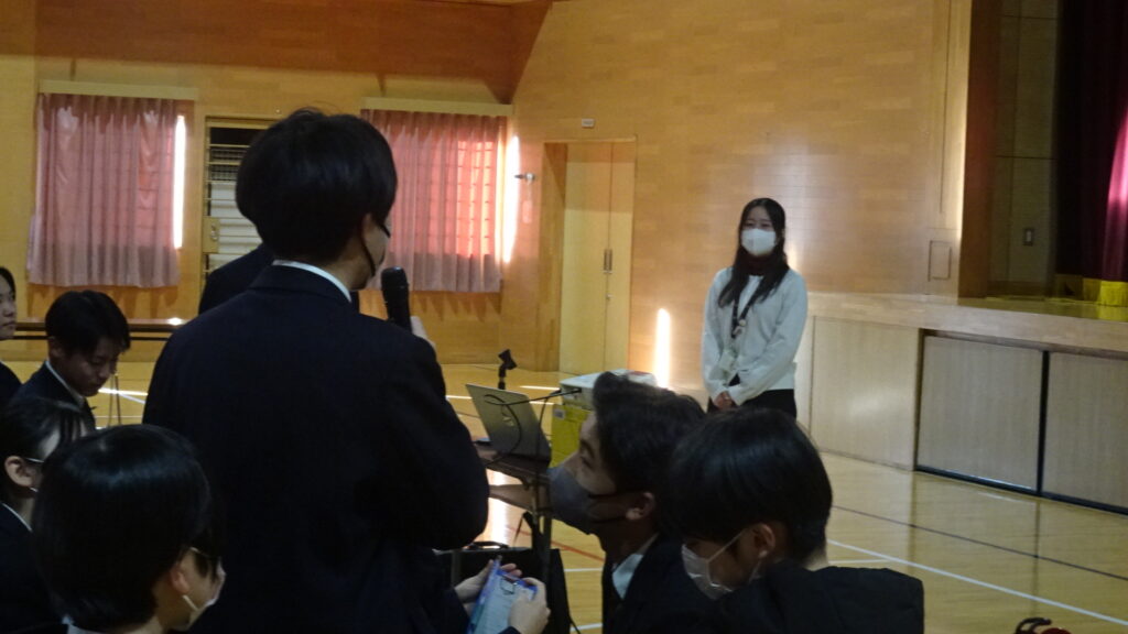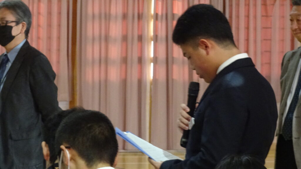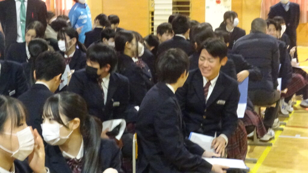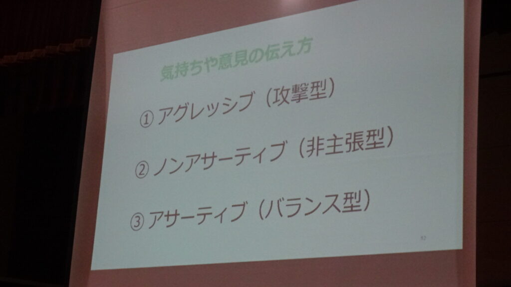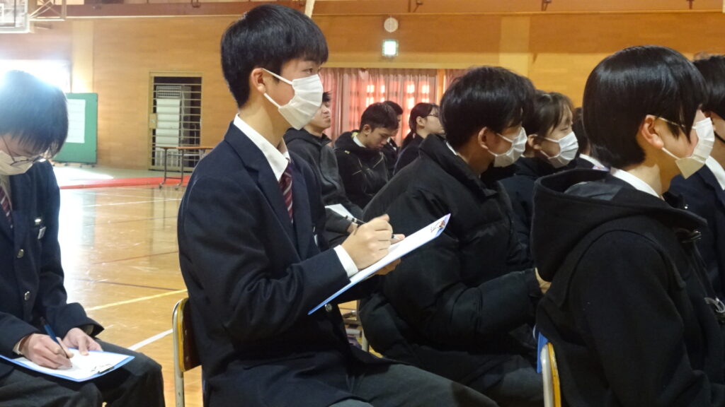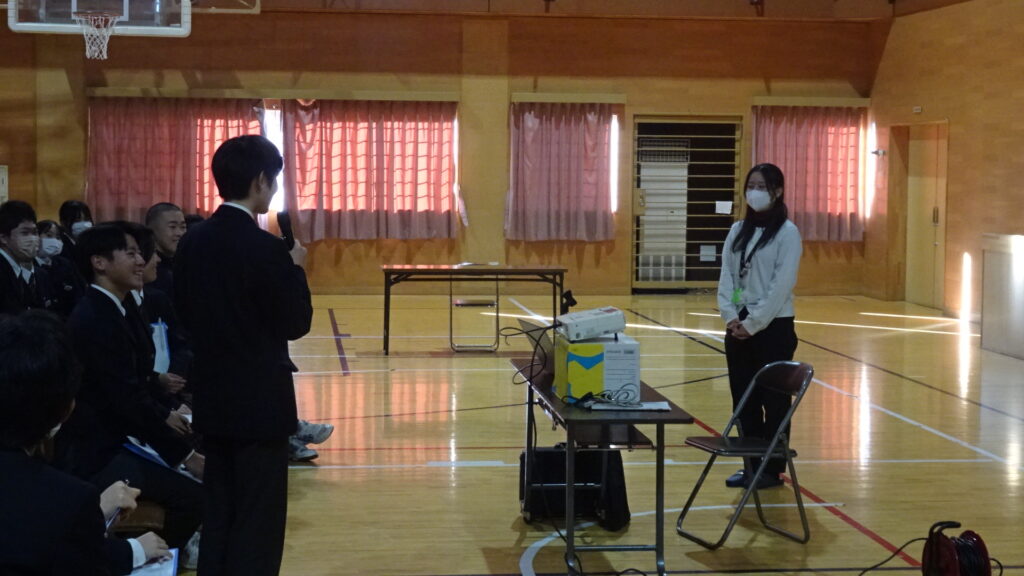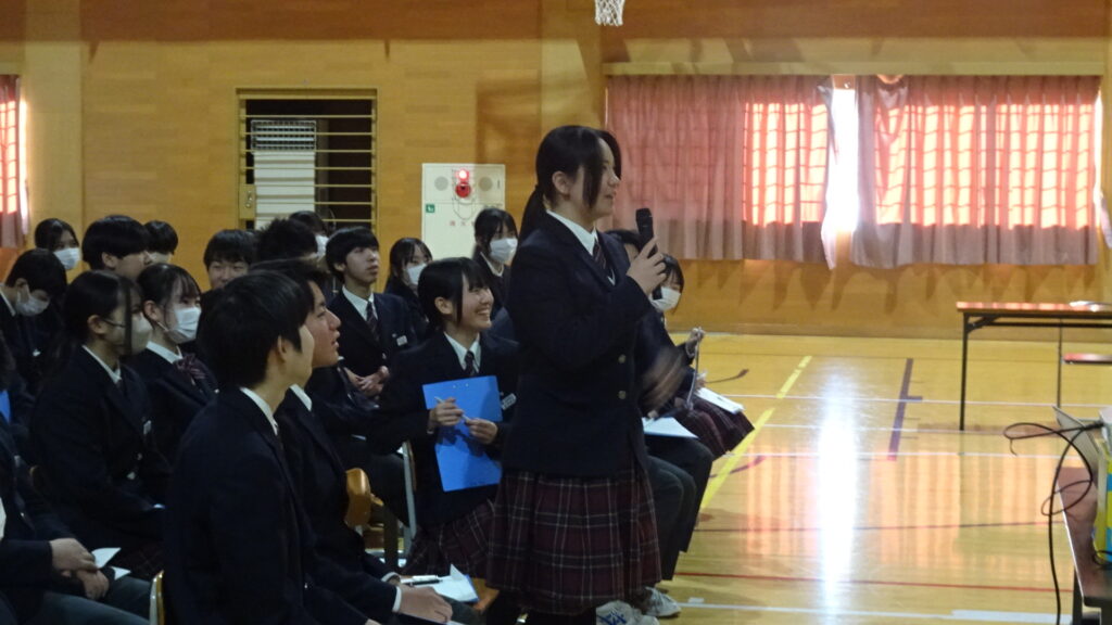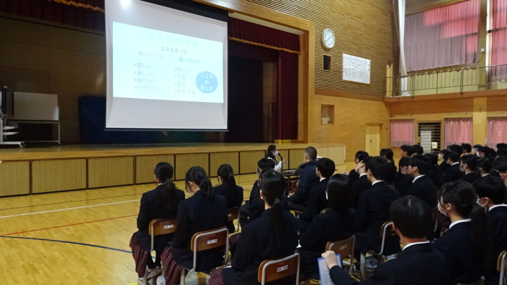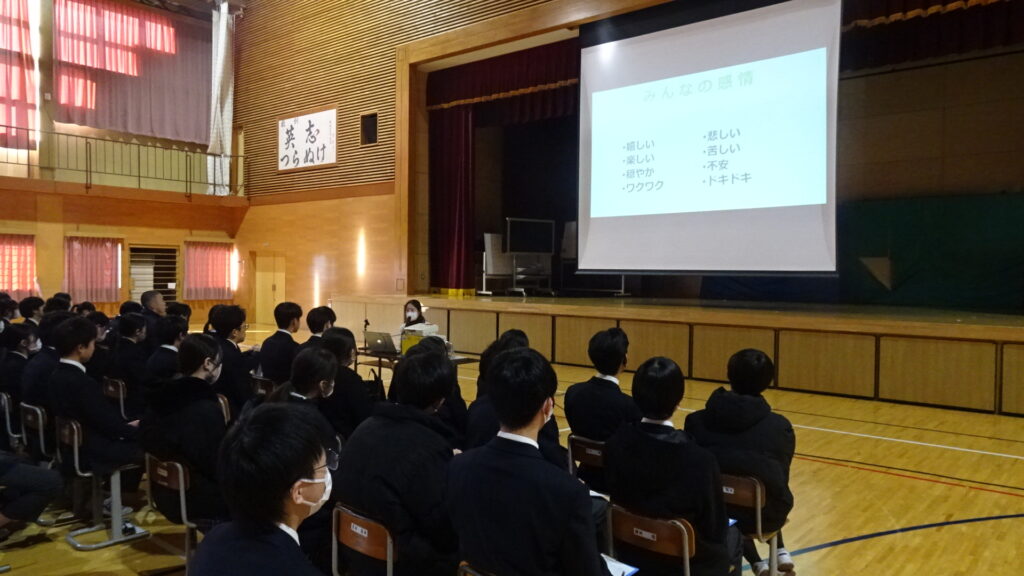 12月10日(水)、男鹿市子育て健康課の井上様を講師としてお招きし、3年生が「SOSの出し方講座」を受講しました。講座では、「感情と心のエネルギーについて」、「ストレスについて」、「つらいときの対処法について」など様々な視点からお話がありました。「つらいときの対処法」の一つとして「信頼できる人に話してみる」という方法が提案され、少なくとも3人の大人に話してみることを勧めてくださいました。講座の中盤には、気持ちの伝え方に「アグレッシブ(攻撃型)」「ノンアサーティブ(非主張型)」「アサーティブ(バランス型)」があることが紹介され、実際に伝え方を考えてみる演習を行いました。最後に各学級の代表生徒が感想を発表し、講座が終わりました。井上様の講座を受講し、3年生はSOSを出すことは恥ずかしくないことであると学びました。