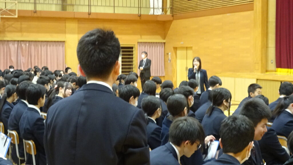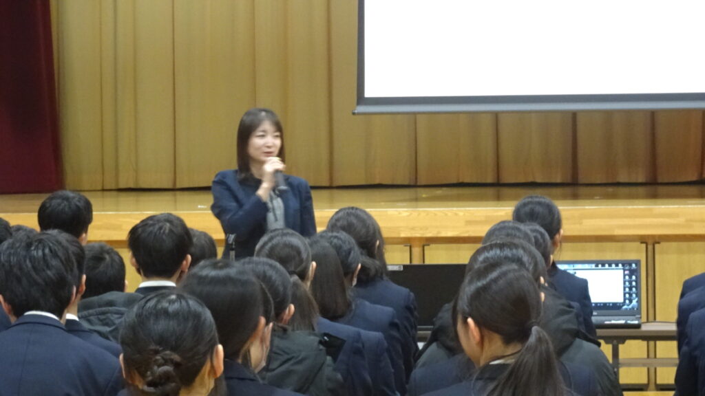 12月17日(水)、1・2年生PTAに合わせて、秋田臨港警察署少年育成支援官の佐々木なつみ様を講師に招き、生徒と保護者を対象とした情報モラル教室を開催しました。講話の中では、「スマホのトラブルの責任は保護者にあります。学校ではありません。」「スマホは保護者が契約して子どもに貸しているだけです。スマホの利用を停止する権利は保護者にあります。」など保護者の責務についてお話がありました。最後に視聴したDVDでは、誤ったSNSの使い方が与える途方もない影響が実感できました。11月の入学説明会での警察の講話でも、「スマホのトラブルについて保護者が責任をとることになる。学校ではない。」という今回とまったく同様の話があり、スマホの契約者という立場の重さを改めて認識しました。