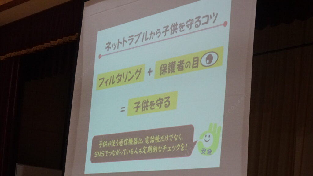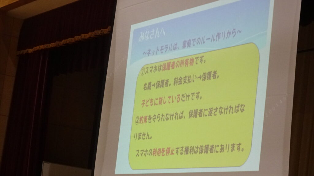 このスライドの際、「スマホの利用を停止する権利は保護者にある。」と説明。