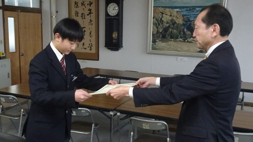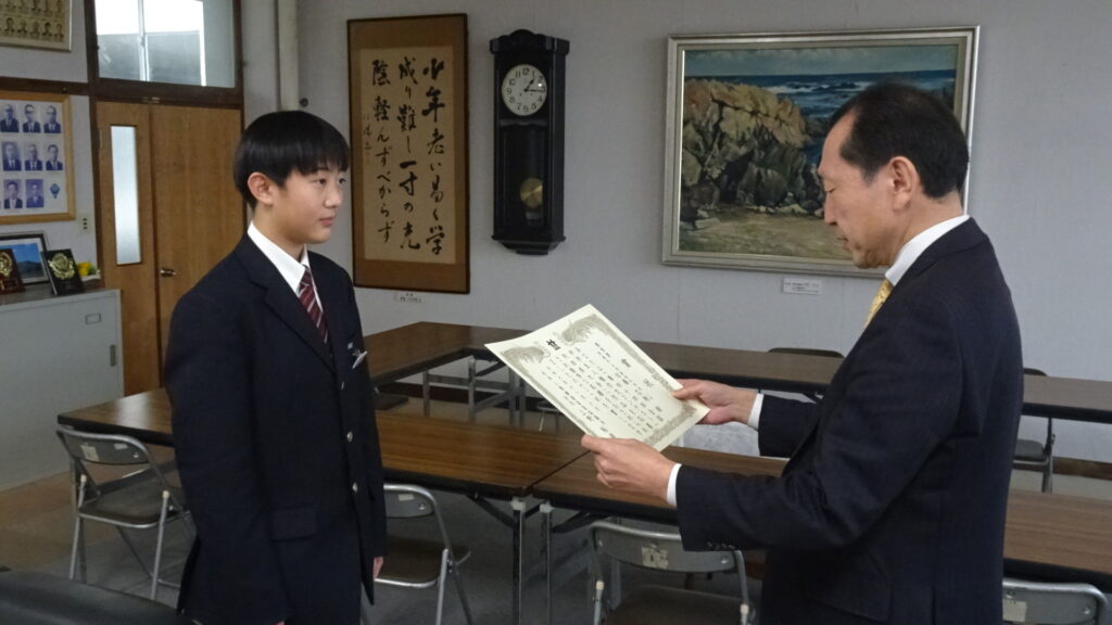 12月22日(月)の昼休み、第44回全国中学生人権作文コンテスト秋田県大会での優秀賞獲得について表彰が行われ、表彰状のほかに副賞も授与されました。おめでとうございます。