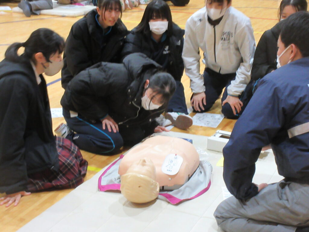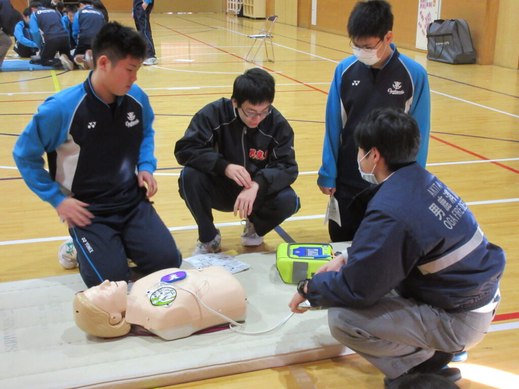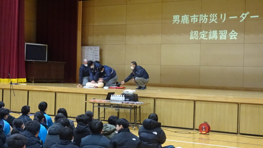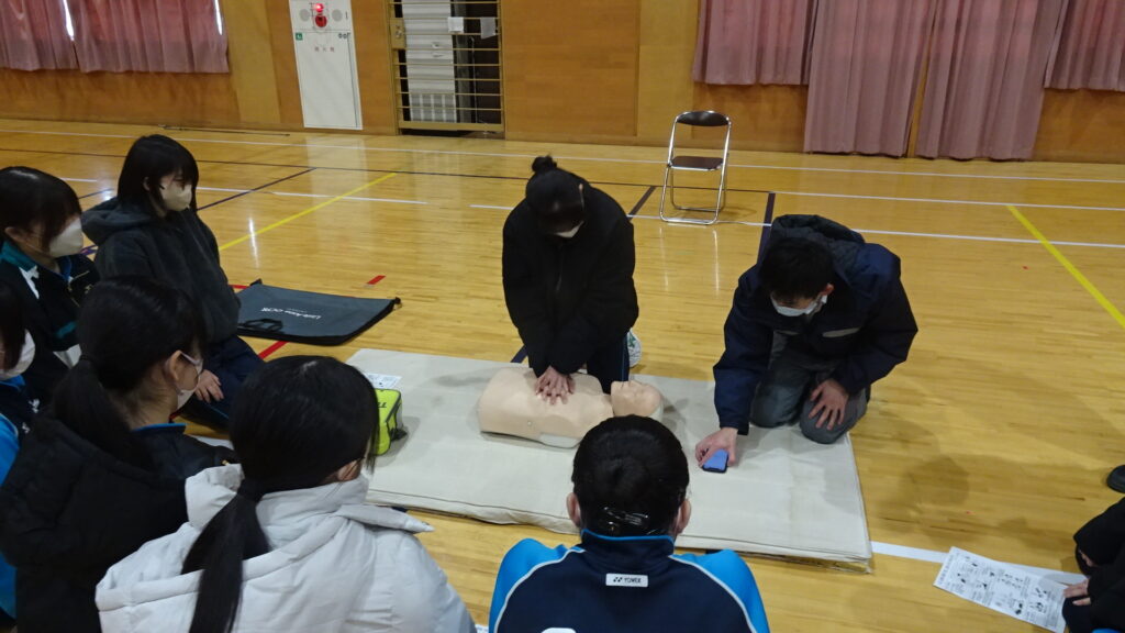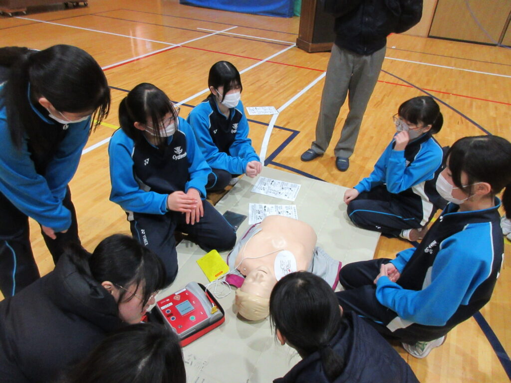 1月16日(金)、「男鹿市防災リーダー認定講習会」の1回目が開催され、2年生が男鹿市初の中学生防災リーダーを目指して動き出しました。10名の消防職員が来校し、4校時に救命救急の講話を聴いたあと、5校時には胸骨圧迫による心肺蘇生法について、6校時にはAEDを使った心肺蘇生法について体験を通して学びました。実技体験については、体育館に10ブースを設置してくださったので、約10名程度のグループに分かれてじっくり体験ができました。3月に開催される2回目の講習会を終えると認定証が交付されるようです。能登半島地震があり、半島で災害があった場合の困難さが広く理解されるようになりました。非常時に東中生が防災リーダーとして力を発揮できれば、市民の誰もが助かります。男鹿の未来を担う東中生に期待が膨らみます。