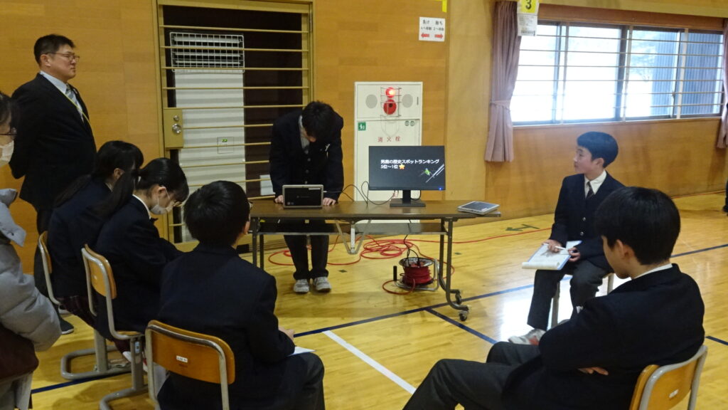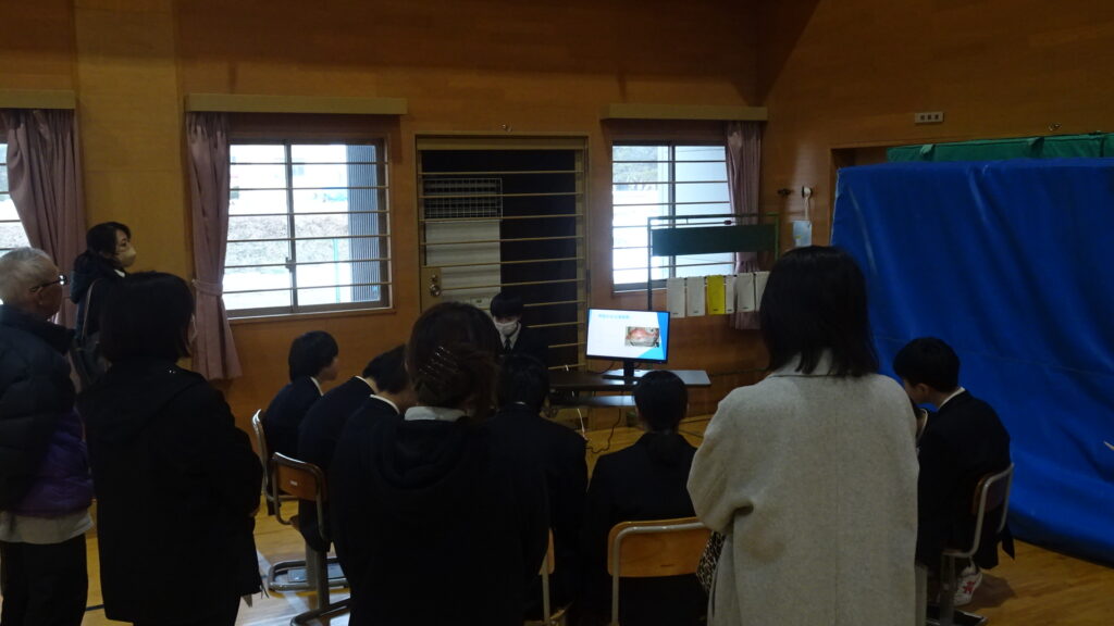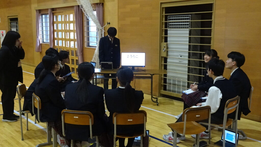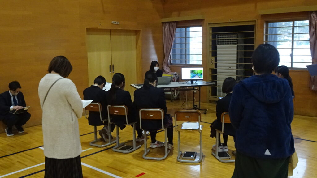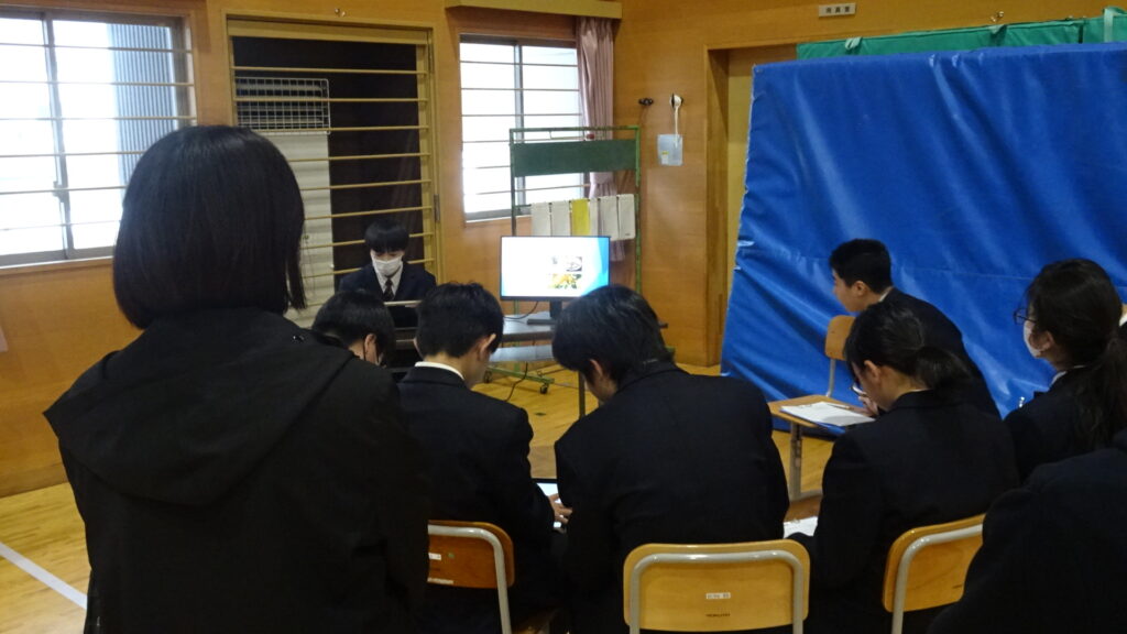 2月18日(水)、1年生が体育館で総合的な学習の時間で探究してきたことについて発表しました。PTAに参加した保護者の方々にも発表を聞いてもらいました。