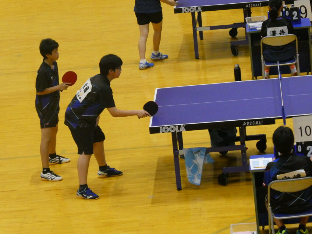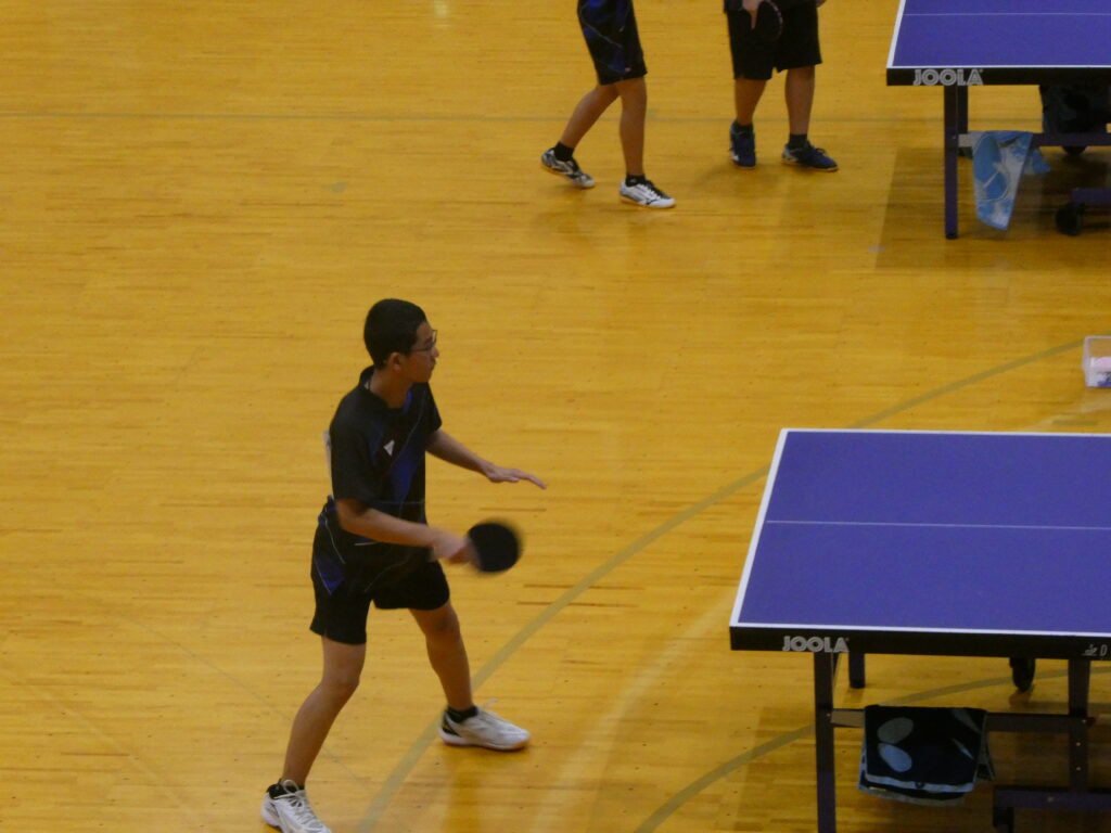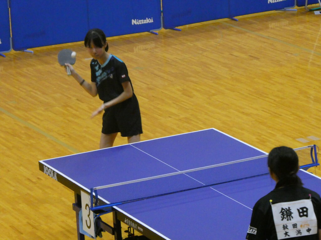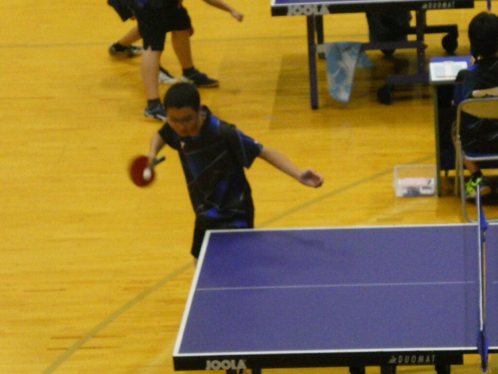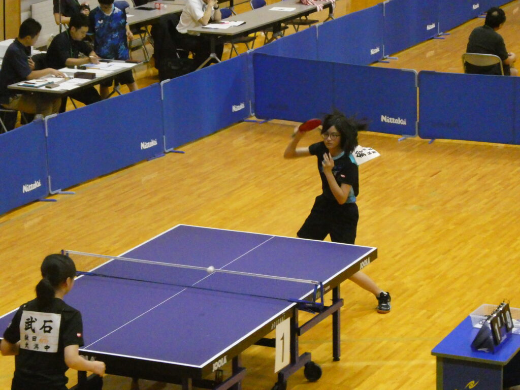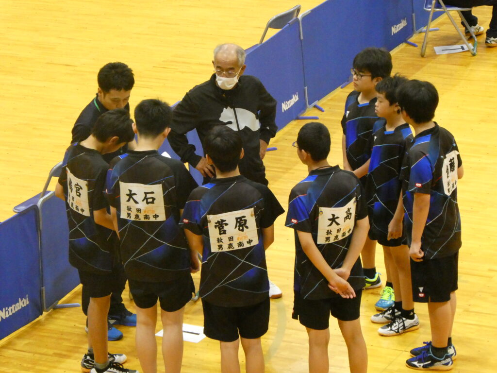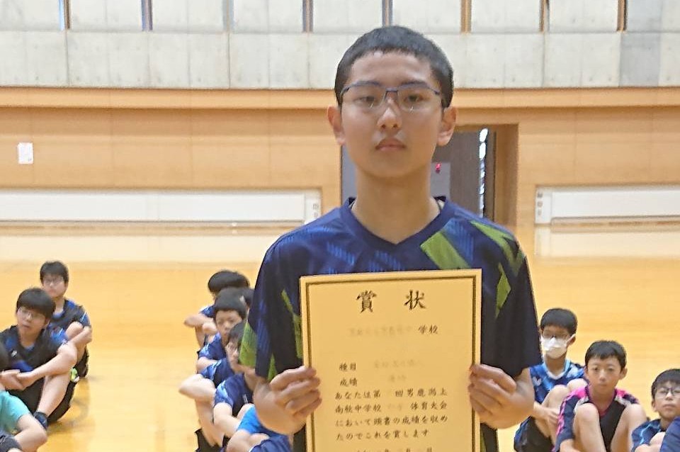 続いて卓球です。男子団体戦は、初日の予選リーグを全勝で一位通過し、準決勝で男鹿東中に、決勝では天王中にそれぞれストレート勝ちし、見事団体優勝を果たしました。男子個人では大高選手が優勝、大石選手が3位、嶋宮選手と菅原選手がベスト8となり、4名が全県大会出場を決めました。全県大会での活躍を期待しています。