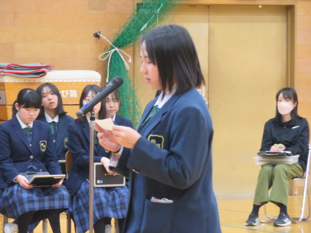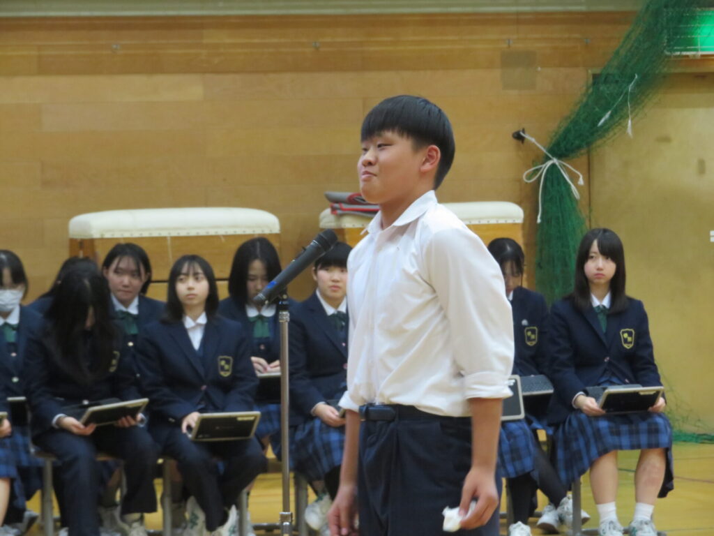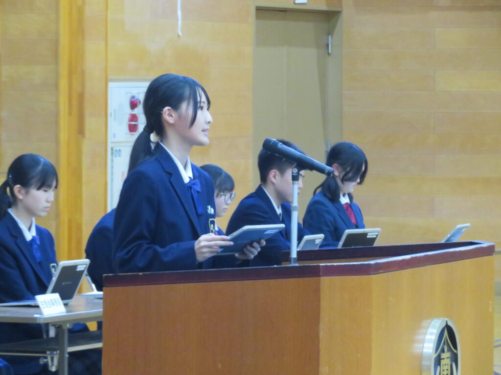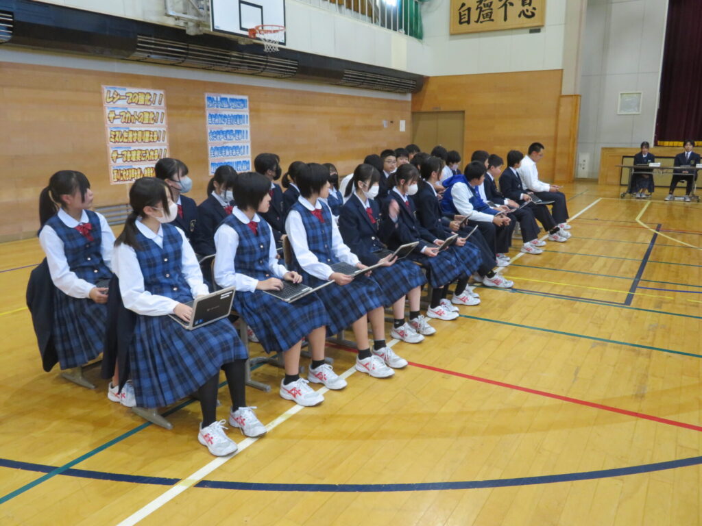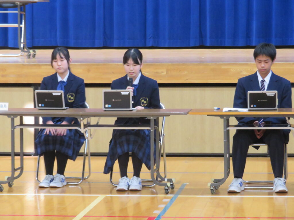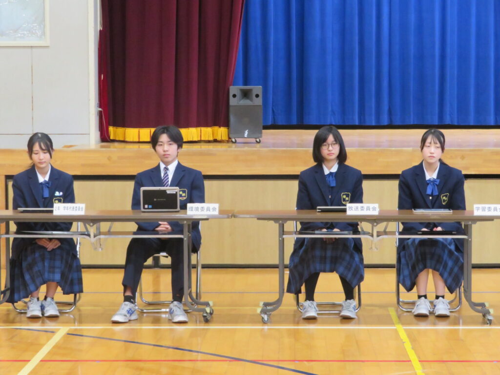 10月30日に、後期生徒総会が開催されました。生徒会執行部や各委員会の代表は、3年生から1、2年生にバトンが渡され、後期の生徒会活動方針や各委員会の活動方針について意見交換がなされました。