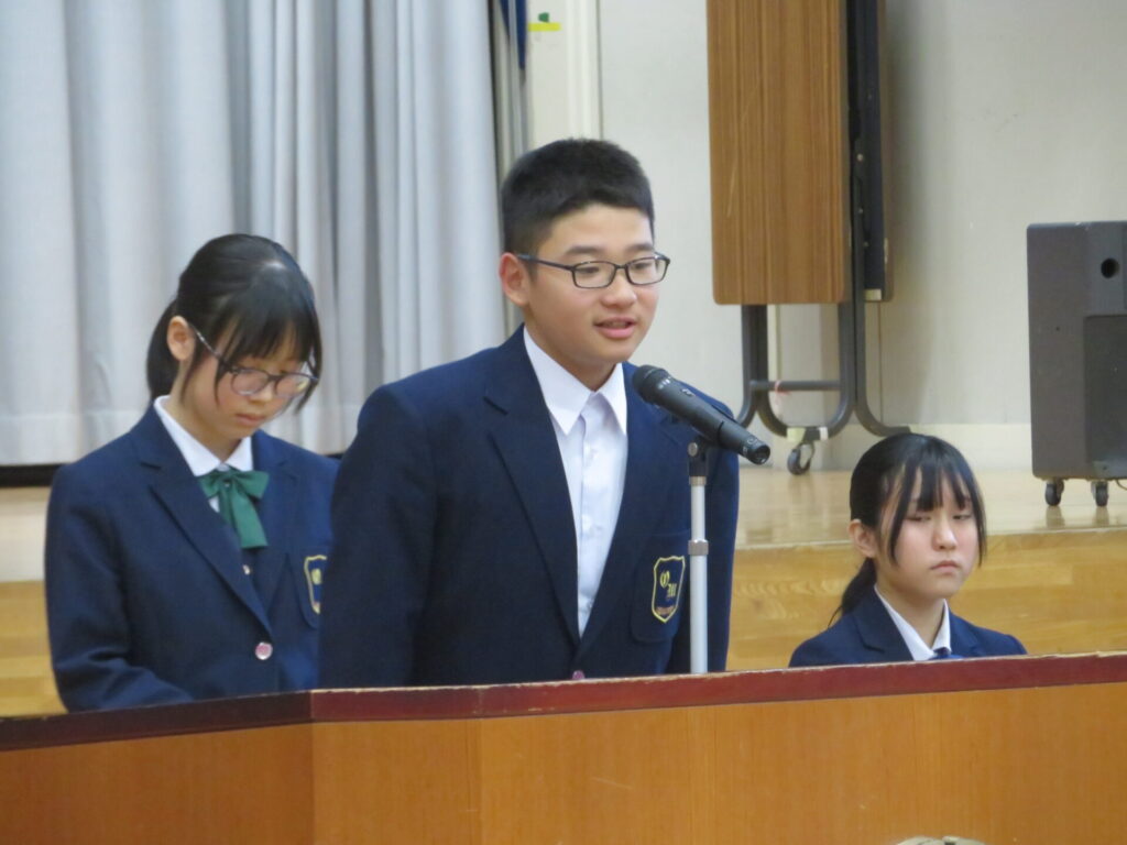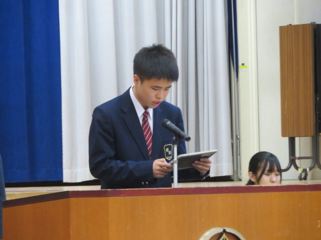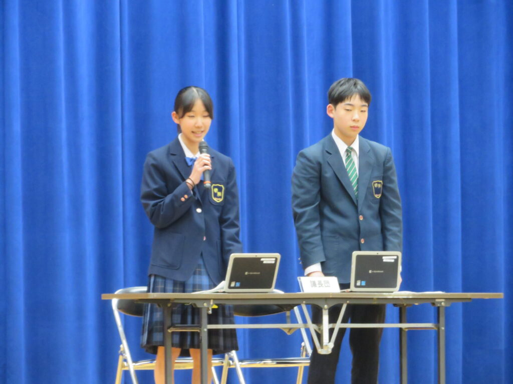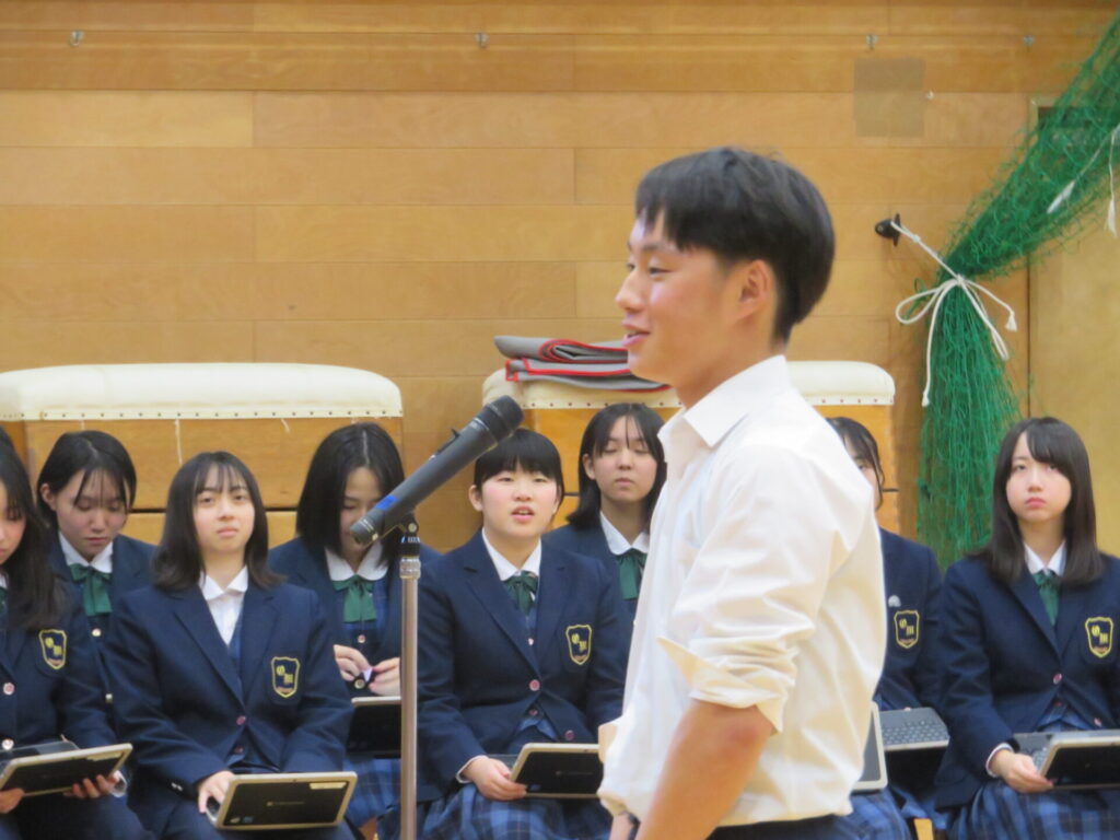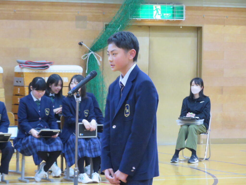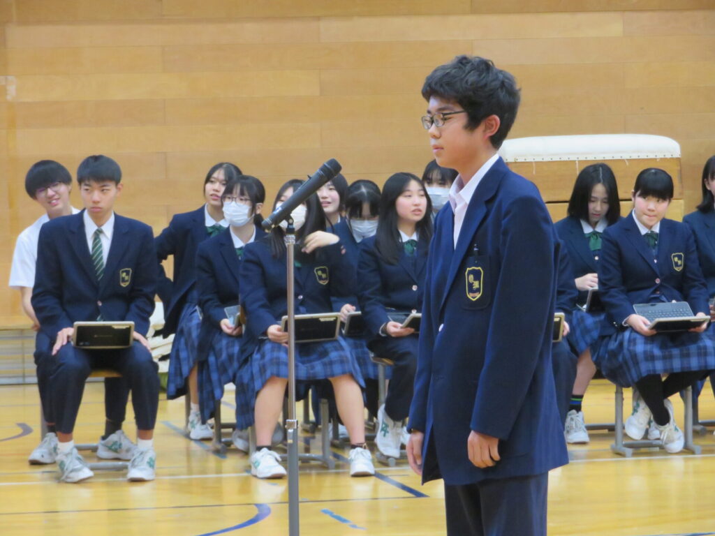 10月30日に、後期生徒総会が開催されました。生徒会執行部や各委員会の代表は、3年生から1、2年生にバトンが渡され、後期の生徒会活動方針や各委員会の活動方針について意見交換がなされました。