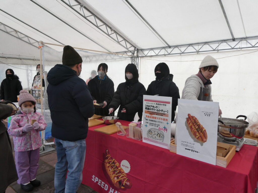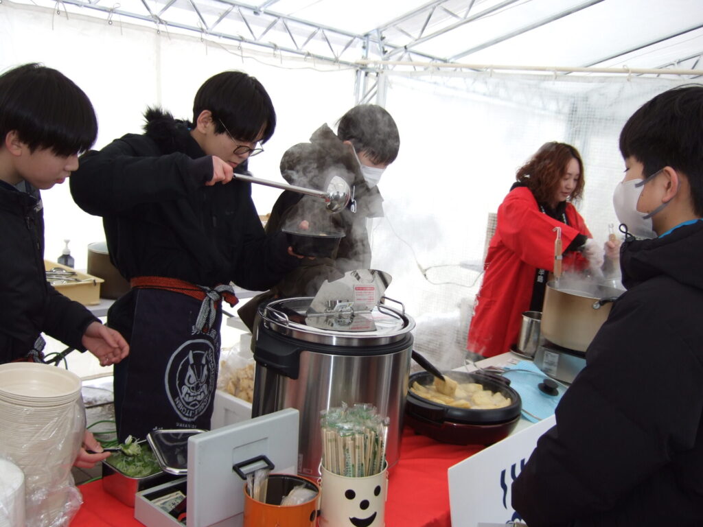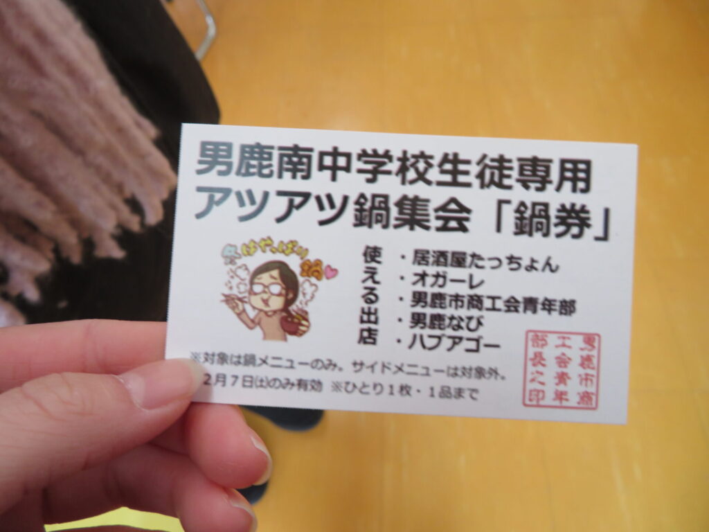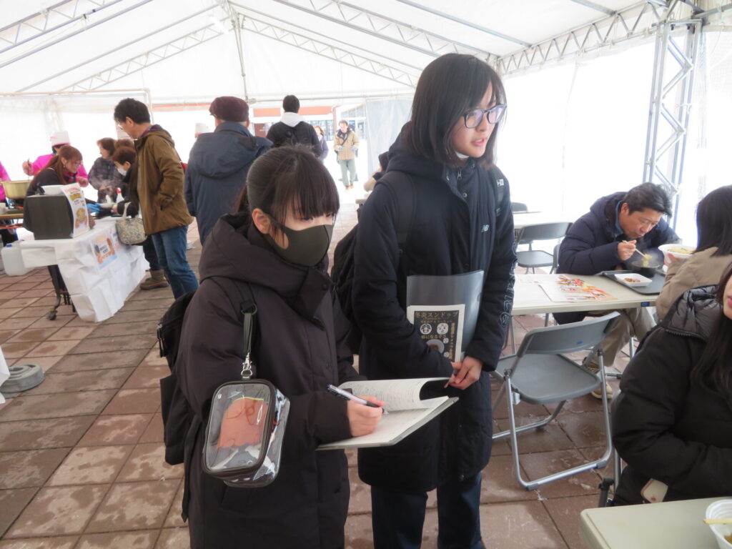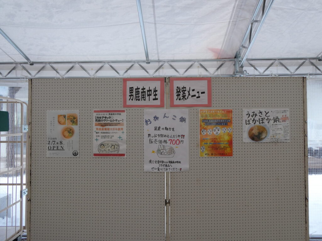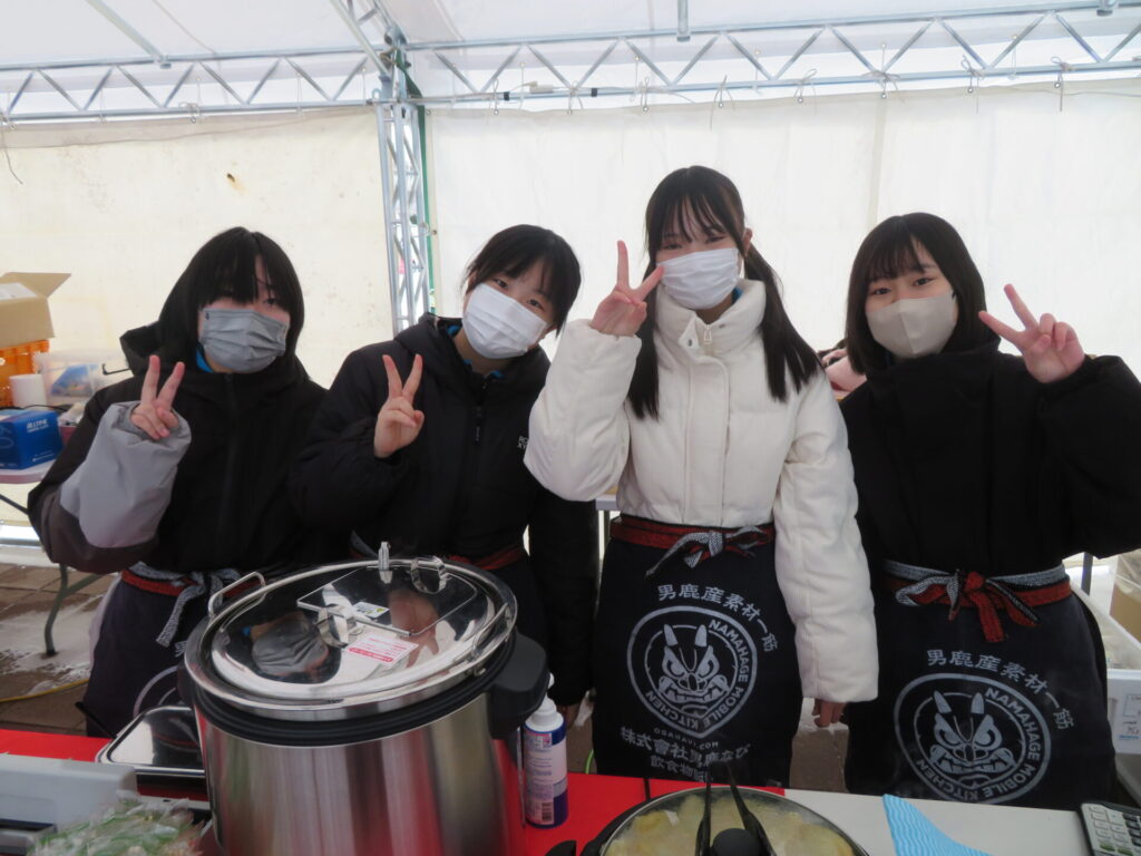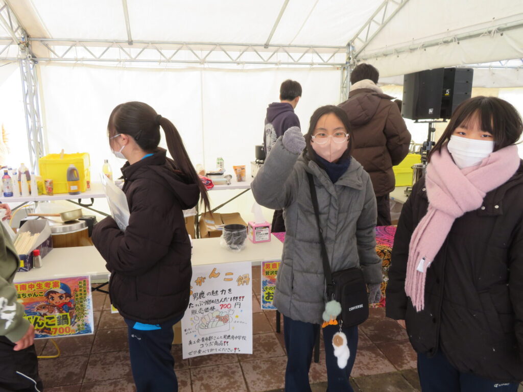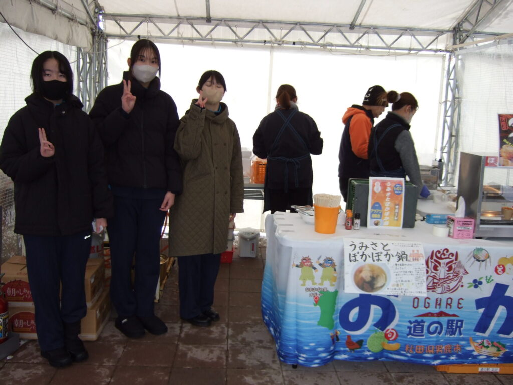 ここからは鍋集会での活動です。オガーレや男鹿駅での宣伝、テント内の飲食ブースでの接客を行いました。南中生は飲食券を作成していただき、自分たちも鍋を堪能しました。また、来場いただいた方々へのアンケート調査も行いました。