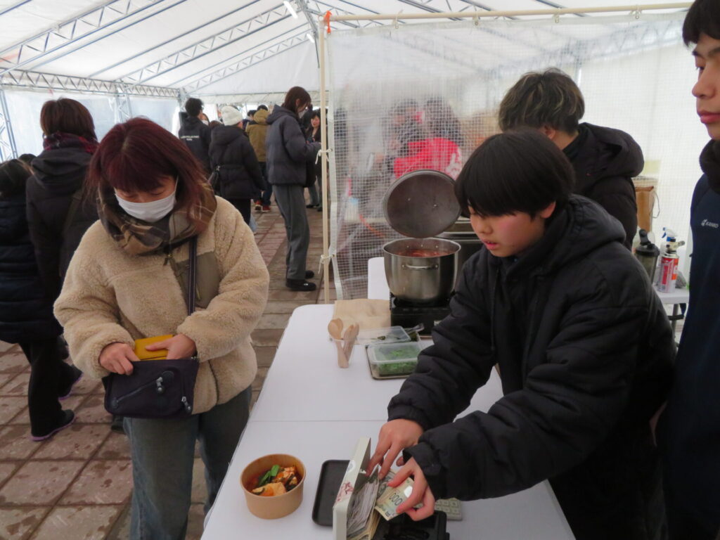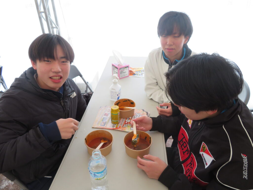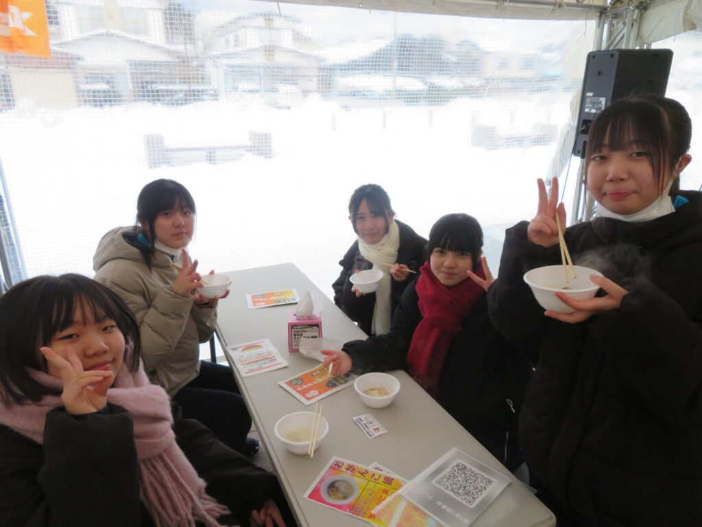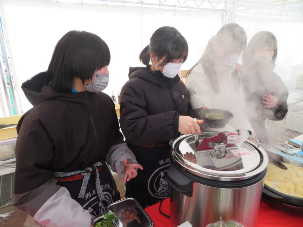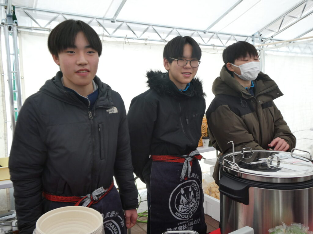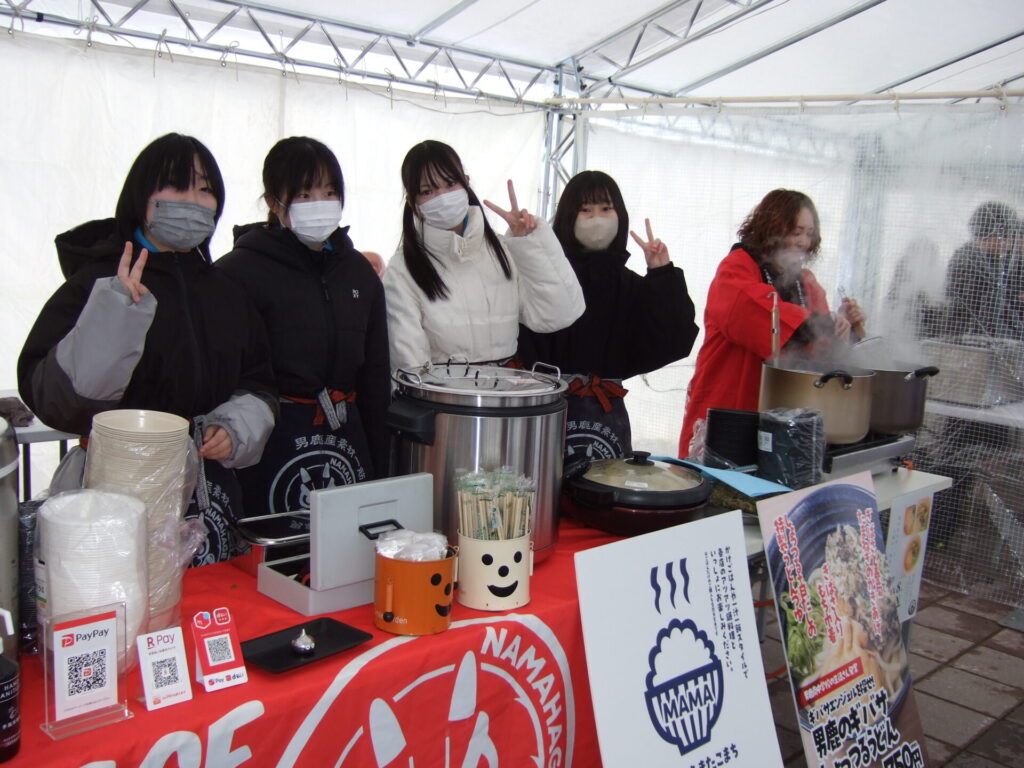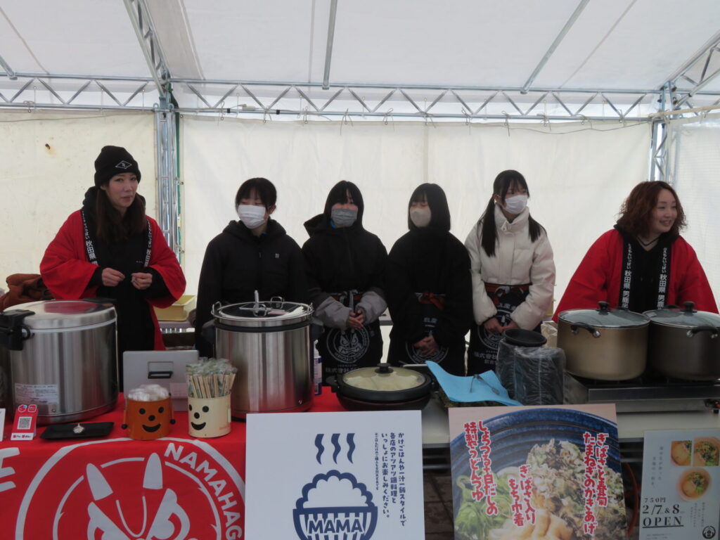 ここからは鍋集会での活動です。オガーレや男鹿駅での宣伝、テント内の飲食ブースでの接客を行いました。南中生は飲食券を作成していただき、自分たちも鍋を堪能しました。また、来場いただいた方々へのアンケート調査も行いました。
