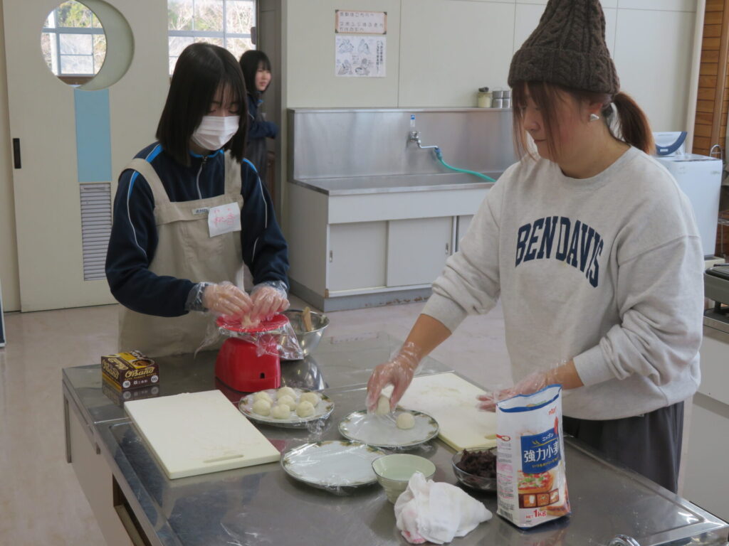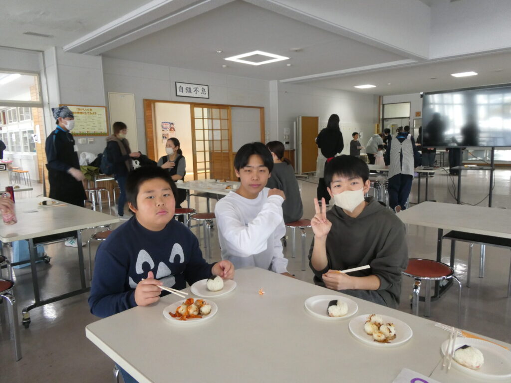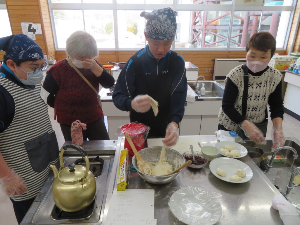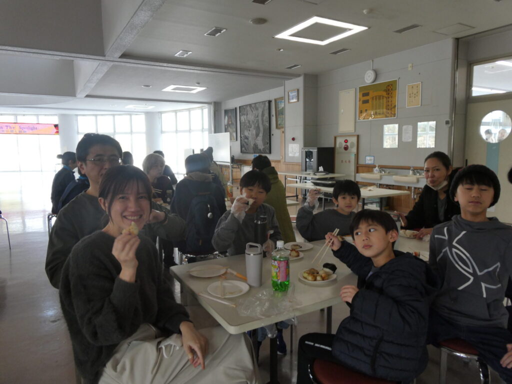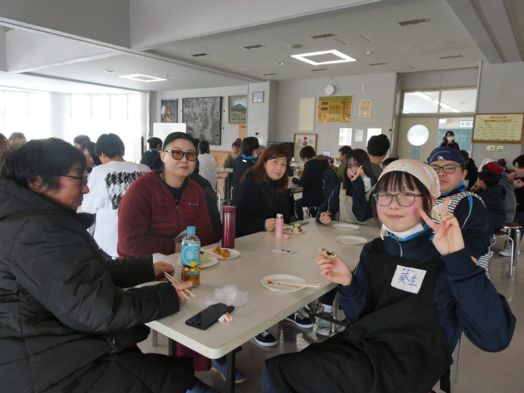 スポーツや和太鼓で楽しんだ後は、食を通しての交流です。おやき、焼きだまこ、おにぎりをそれぞれ作り、食べながらリーレットトークなどを楽しみました。