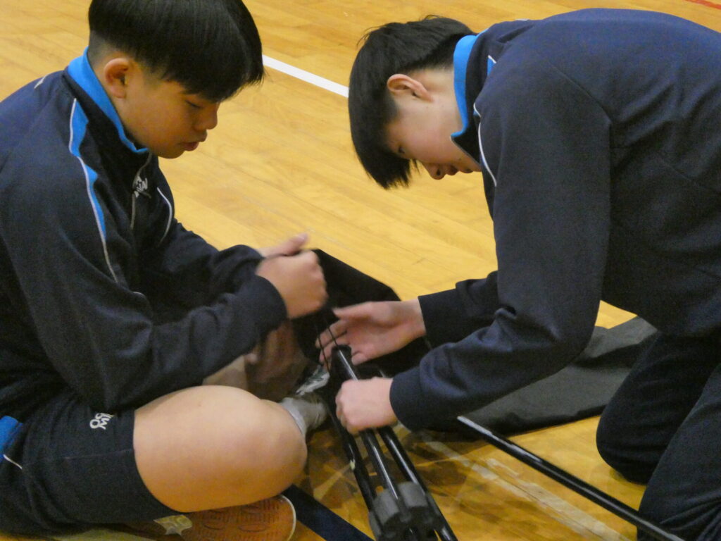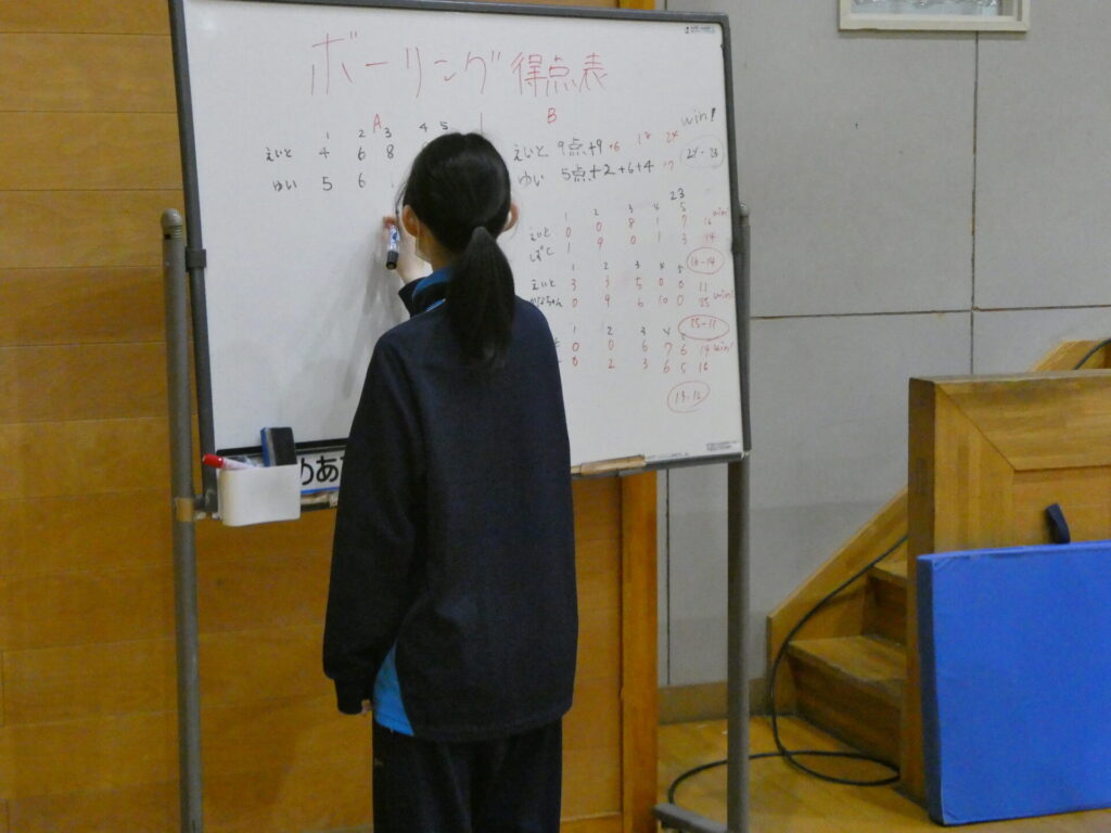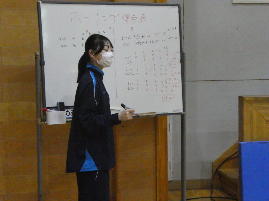 体育館で行われたスポーツのようすです。ミニテニスと手作りボーリングを楽しみました。ミニテニスではペアを組むことで新たなつながりもできました。ボーリングも盛り上がりました。
