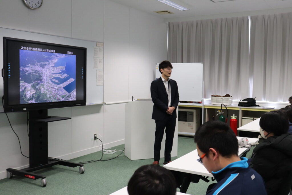 始めに、市役所の職員から洋上風力に関連して様々な企業の進出があり、「生徒の皆さんにも感心をもってもらいたい」「新たな企業の進出は、他の産業の活性化にも繋がる」とのお話しを聞きました。