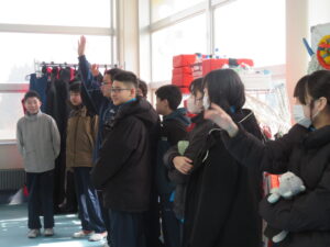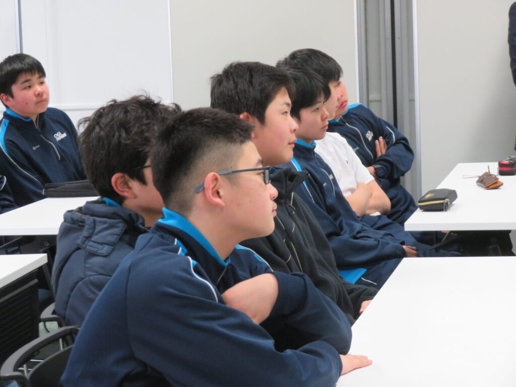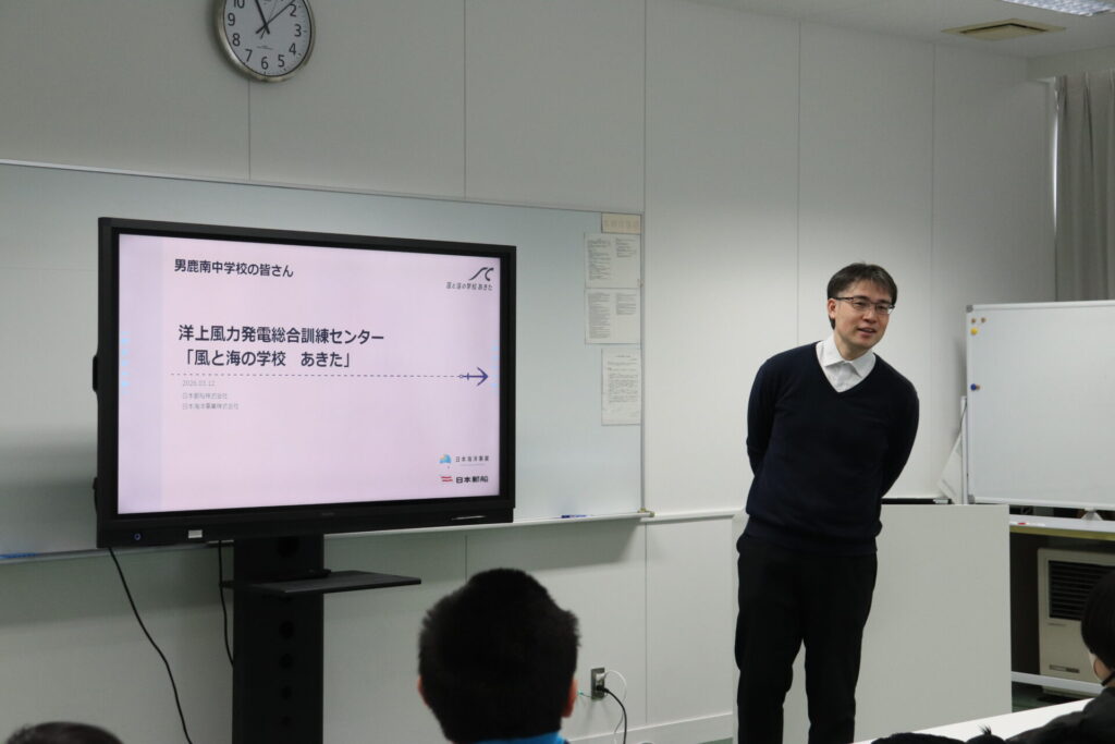 続いて、この訓練センターを運営している秋田オフショアトレーニング株式会社の方から、洋上風力発電のことや、訓練センター開設の意義を教えていただきました。1年生は、海に関わる仕事に興味を持っている生徒も複数おり、質問への受け答えも活発にしていました。