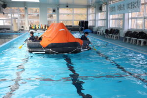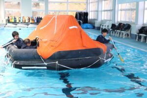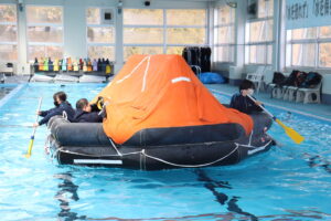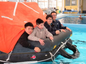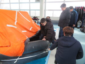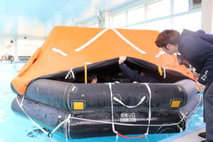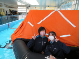 いよいよ体験です。プールでの避難訓練と船のシュミレーターの体験を2班に分かれて行いました。まずは、プールでの体験です。救命いかだに乗り、いかだを漕いでみました。