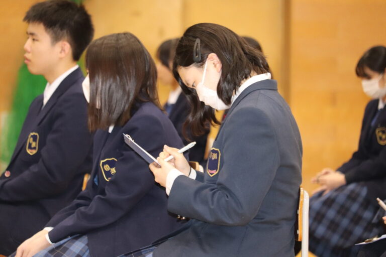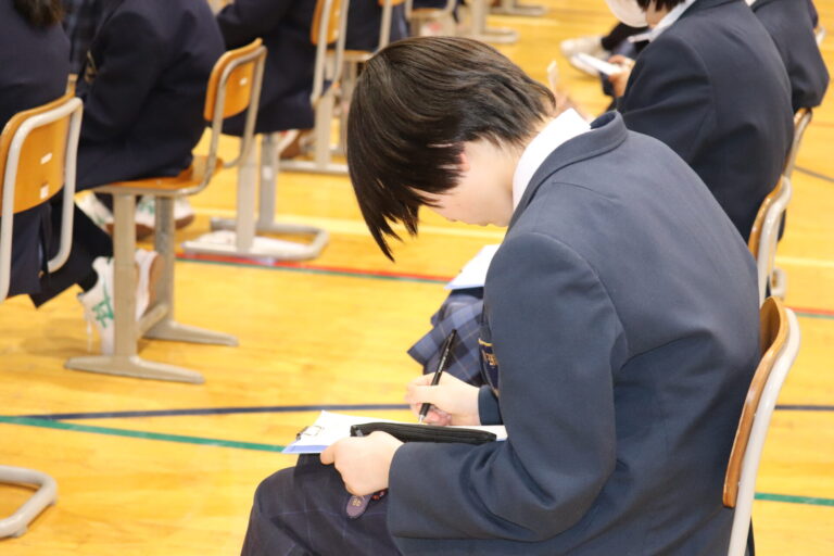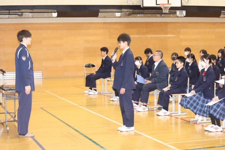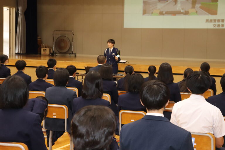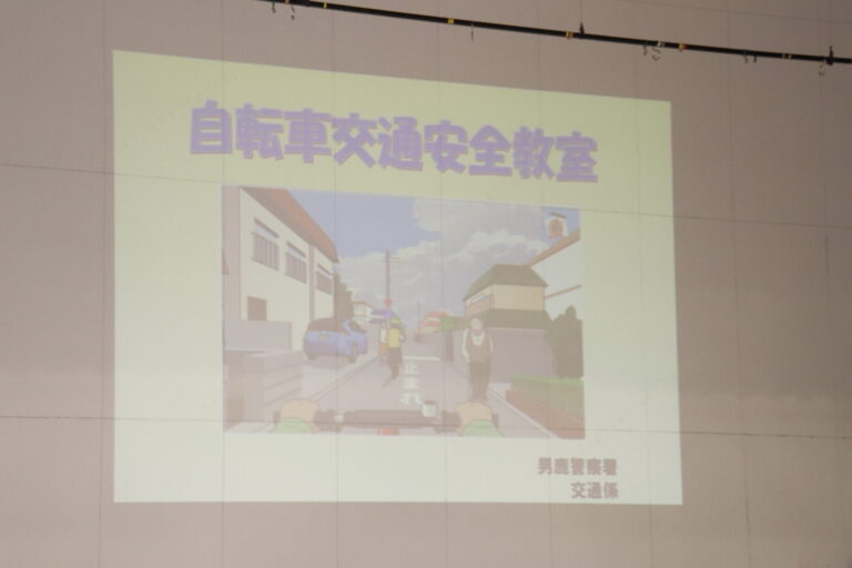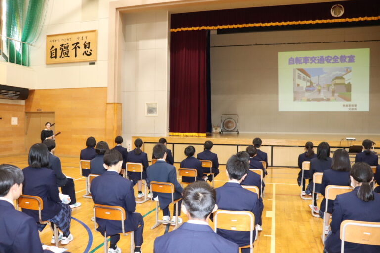 4月13日に、交通安全教室を行いました。交通安全教室は、児童生徒の交通安全意識を高めるために年度初めに毎年行っています。男鹿警察署交通課の越前屋さんをお招きし、自転車の安全な乗り方等についてお話しいただきました。
