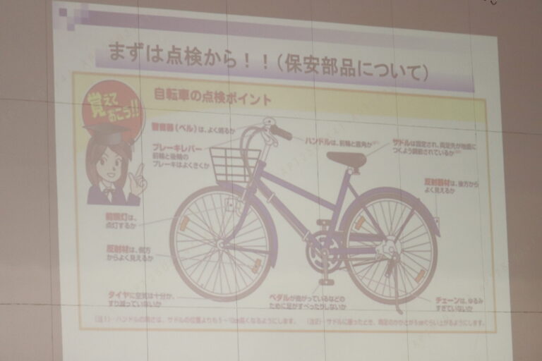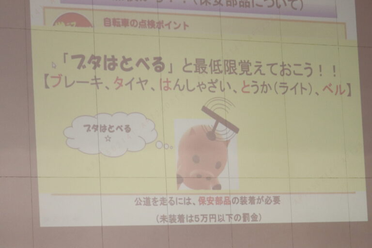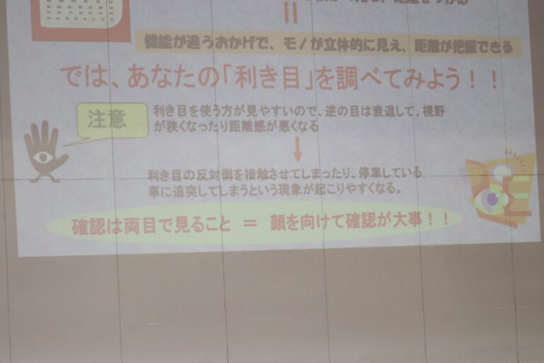 講話では、自転車の安全な走行のために整備が必要な保安部品について「ブタはとべる(ブレーキ、タイヤの空気圧や穴の有無、反射材、前照灯、ベル)」の合い言葉で分かりやすく教えていただきました。また、そんな場所で事故が起こりやすいのかについても教えていただきました。人には「利き目」があり、利き目と逆方向は見づらく、広い範囲を見るよう心掛けなければいけないそうです。自分の利き目が左右のどちらかを実際に確認しました。