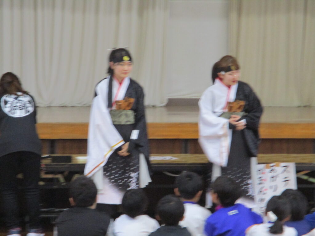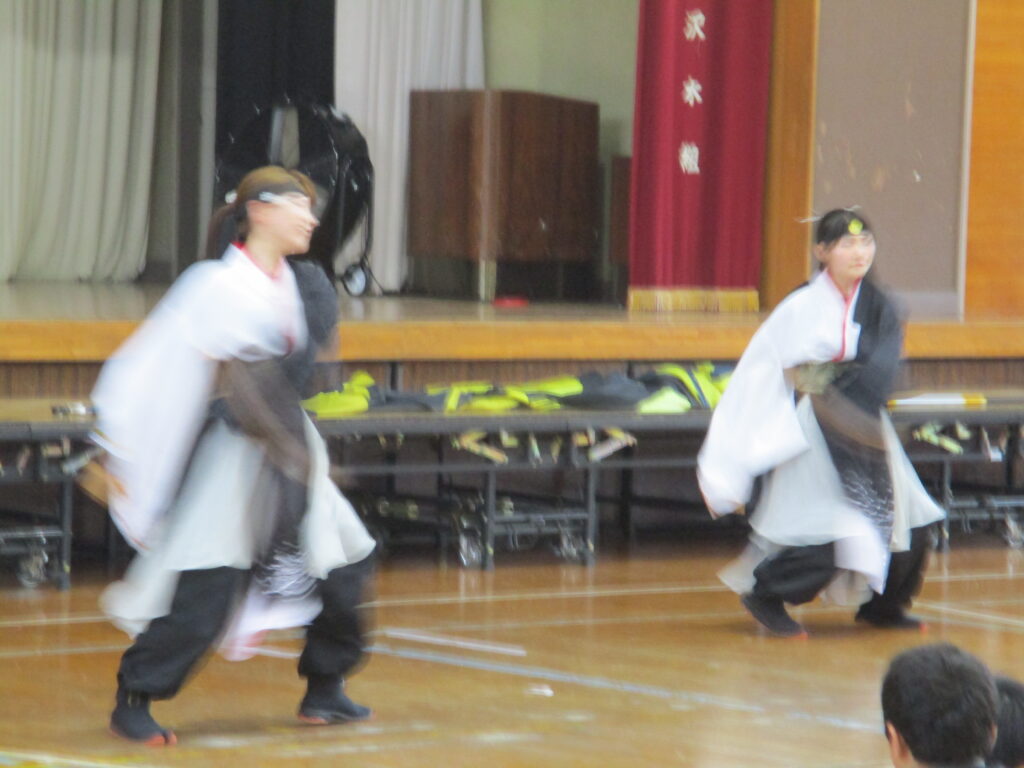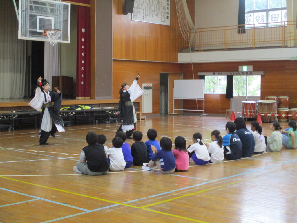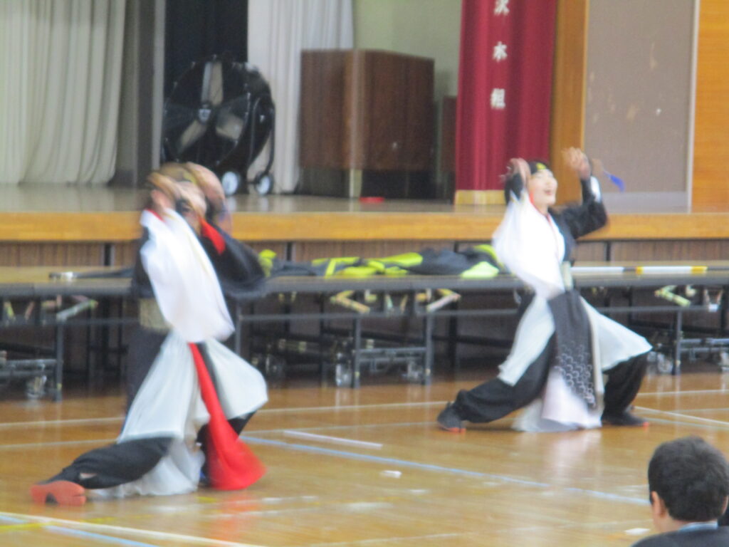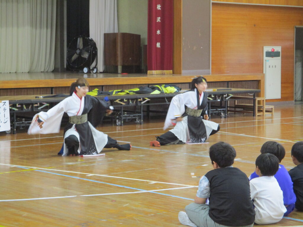 この日本校体育館で、「よさこい」の体験が行われました。本格的によさこいのチームで活動していらっしゃる方2名を講師の先生に、素敵な演舞を見せていただいたり(かっこよかったです)、実際に踊ったりしました。子ども達は教えてもらうとわりと上手に踊れたようで、先生達からお褒めの言葉をいただいていました。