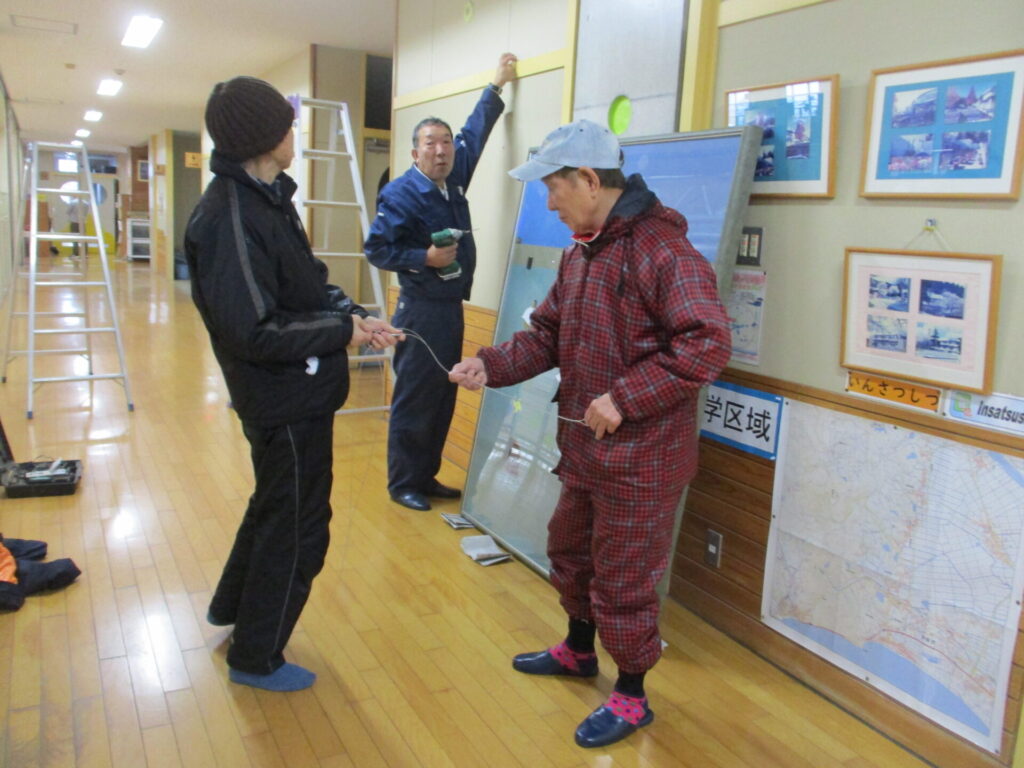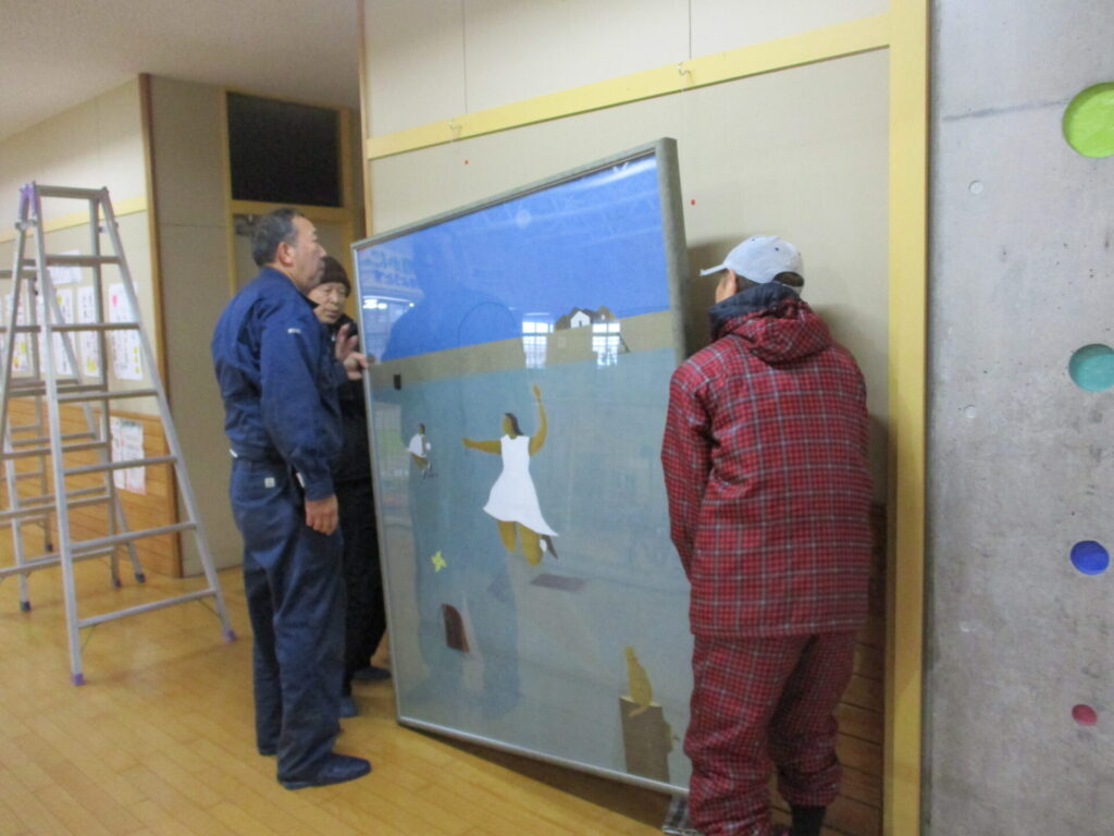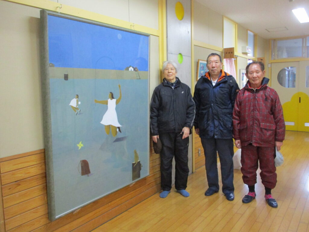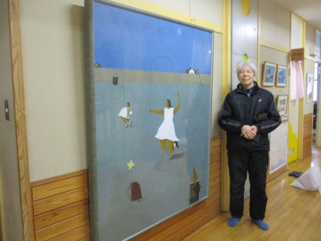 脇本に住んでいらっしゃる中道文雄さんから、素敵な絵を寄贈していただきました。タイトルは「脇本浜 追憶」です。中道さんはこれまでふるさと脇本をモチーフにした絵をたくさん描かれています。今回寄贈していただいた絵も100号ととても大きく、脇本浜で遊ぶ子どもの様子が描かれています。2階印刷室横に展示していただきましたので、校内に入った折にはぜひご覧ください。(展示には、仲町の伊藤さん、渡部さんにもご協力いただきました。)