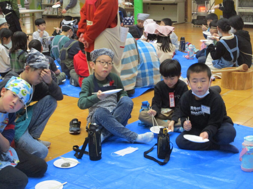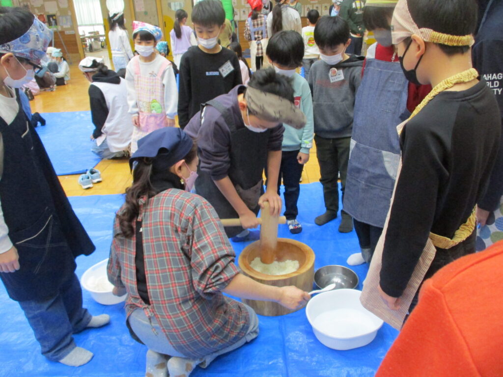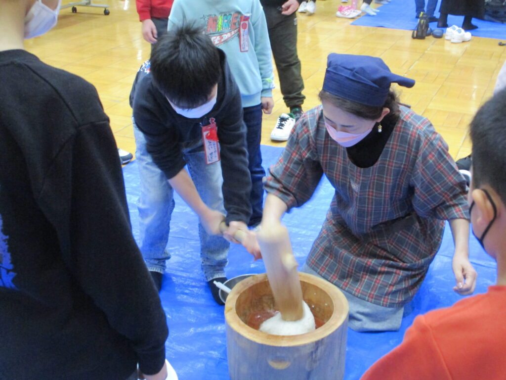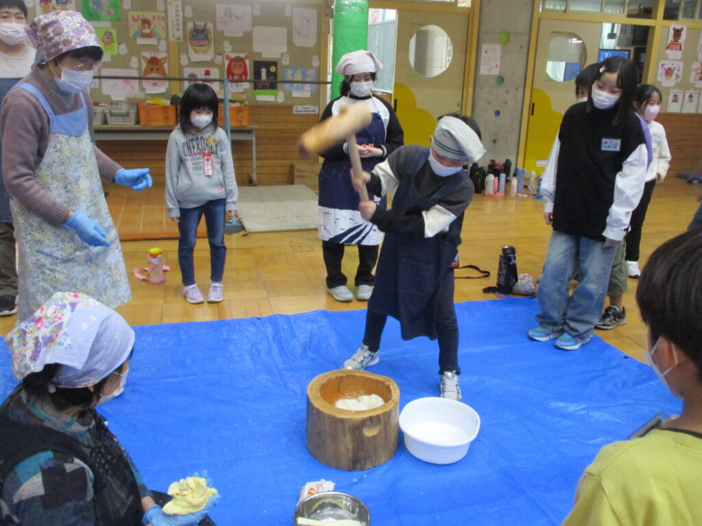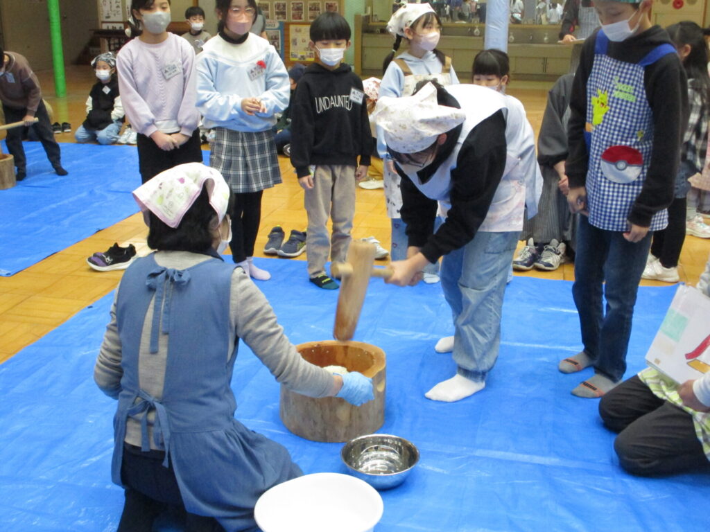 本日、全校でもちつき集会をしました。前日の準備から、当日のもちつき・片付けまで、脇本婦人会、おてら食堂、CS委員の方、保護者の皆様からたくさんお手伝いいただき、なかよし縦割り班毎においしいお餅をつき、食べることができました。臼と杵でつく体験はなかなかできないことで、子どもたちも張り切ってつき、きなことごまもちを何回もおかわりしていました。みんなで力を合わせてついたもちは格別においしかったようです。ご協力いただいた皆様、本当にありがとうございました。