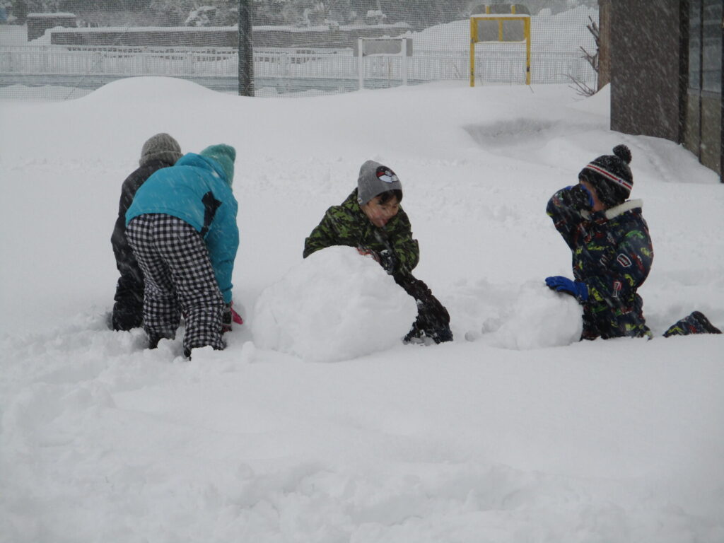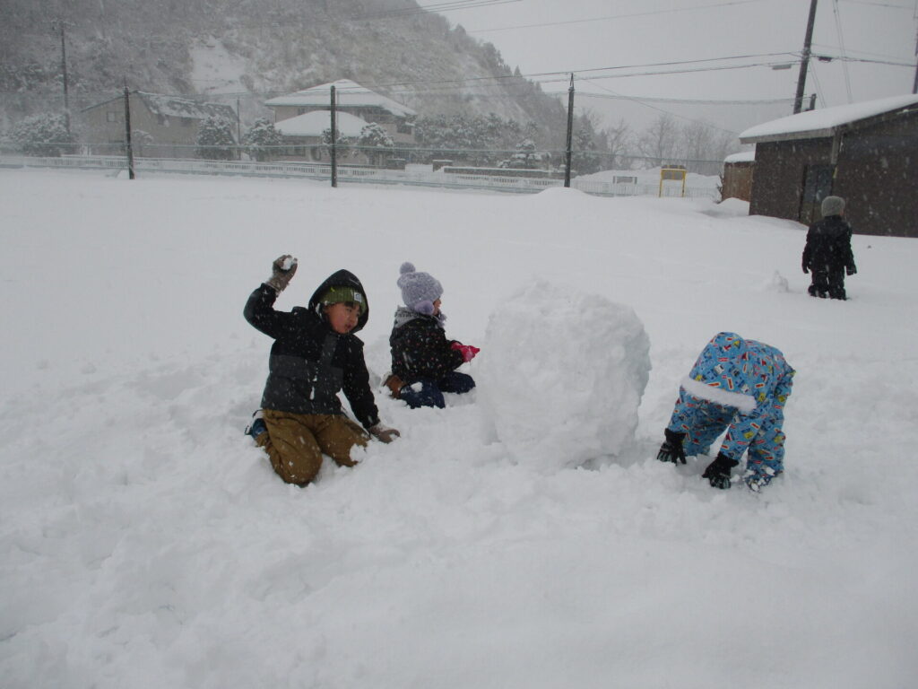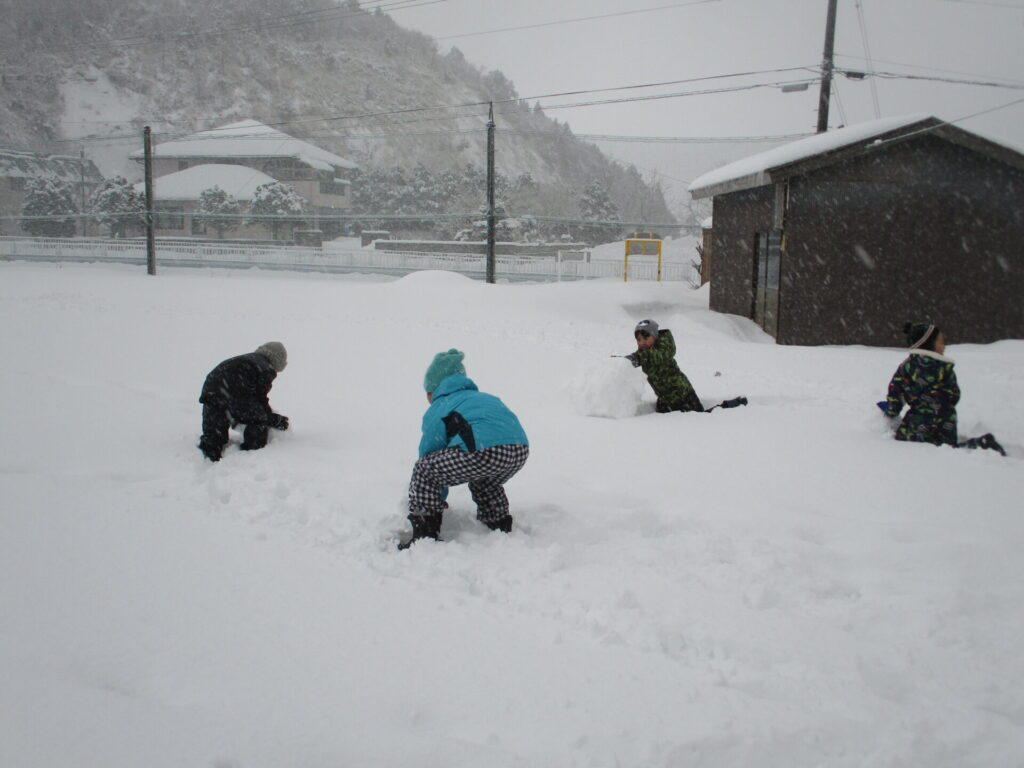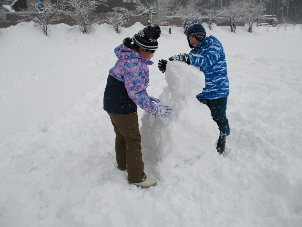昼休み開始と同時にクマ回避爆竹音を鳴らすと、しっかり防寒した脇一っ子達が元気よくグランドに飛び出してきます。雪合戦、雪だるま作り、坂のお尻滑り…ちょっと握るといい塩梅に固まる雪で、だるまもどんどん大ききくなりました。長休みには縄跳び、昼休みには外で雪遊び…寒くても元気に体を動かし過ごしています。