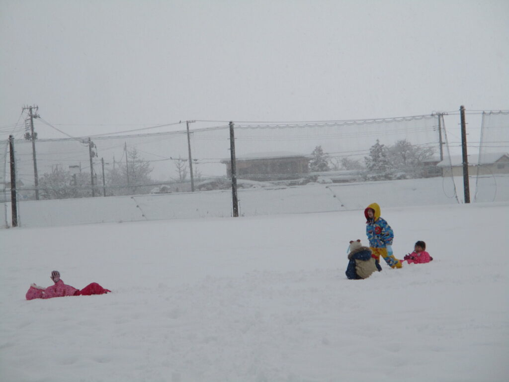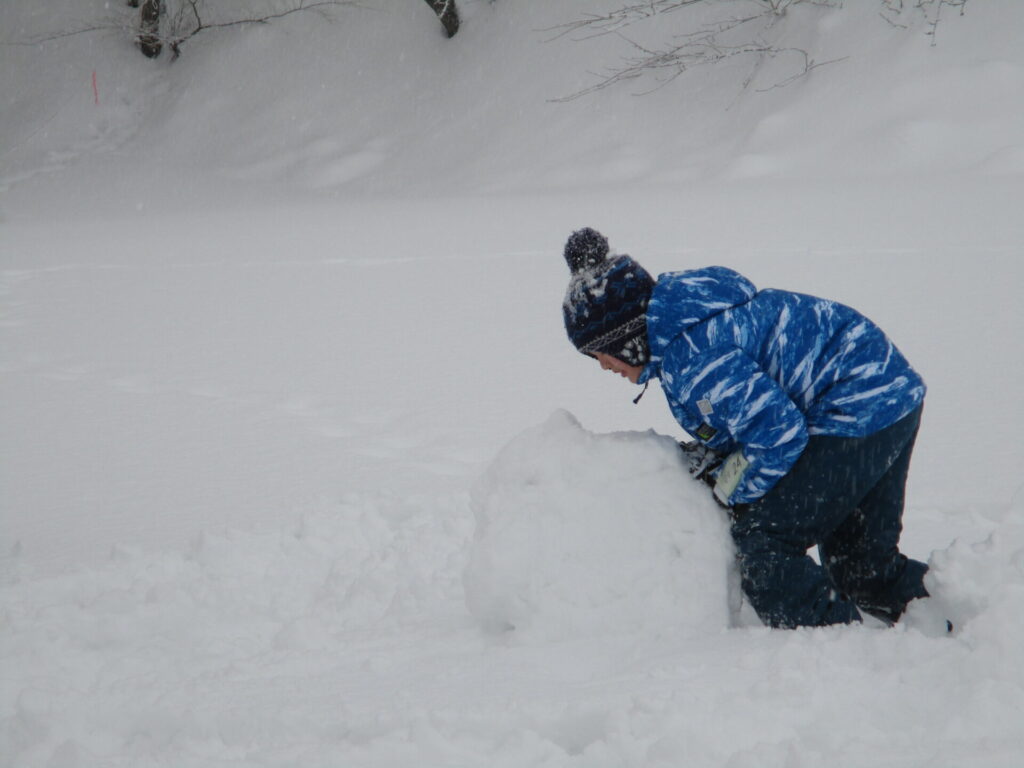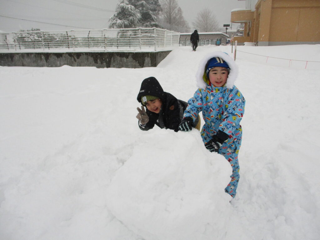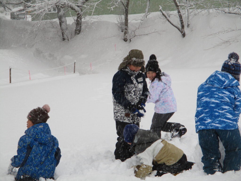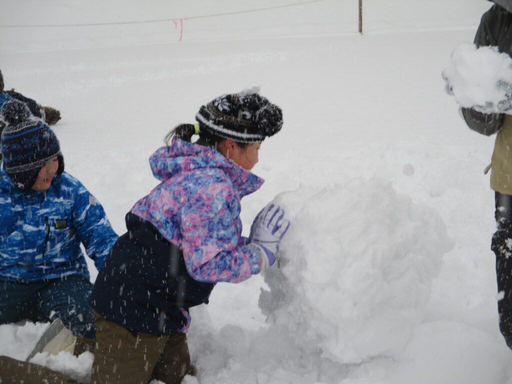 昼休み開始と同時にクマ回避爆竹音を鳴らすと、しっかり防寒した脇一っ子達が元気よくグランドに飛び出してきます。雪合戦、雪だるま作り、坂のお尻滑り…ちょっと握るといい塩梅に固まる雪で、だるまもどんどん大ききくなりました。長休みには縄跳び、昼休みには外で雪遊び…寒くても元気に体を動かし過ごしています。