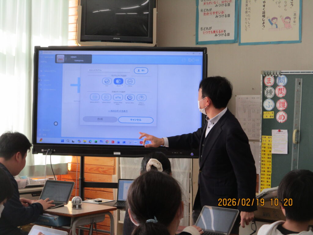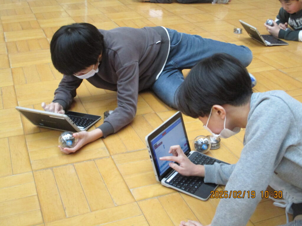 市で導入していただいたプログラミングロボットを、さっそく借用して授業で活用してみました。まずは6年生。教頭先生が理科の授業内で子どもたちに説明すると、あっという間に自分の好きなマーク等や動きをプログラミングし動かしていました。「すごい、プログラムした通りに動く!」「動くスピードを少しだけ速くしてみようかな?」など、どんどん工夫していました。続いて3年生も基本の操作はばっちり、「もっといろいろな動きをプログラムしてみたい!」と意欲満々でした。この後、全学年がロボットを操作していました。