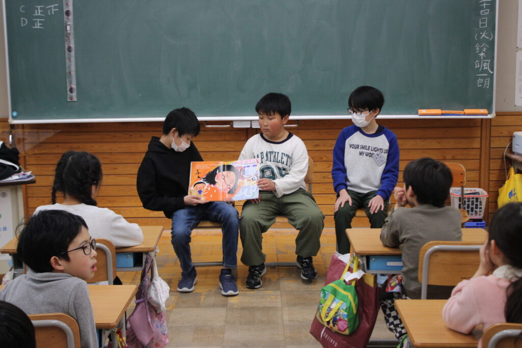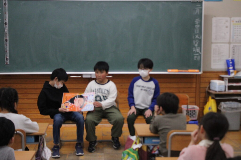 図書委員会メンバーが分担し、昼読書の時間に読み聞かせをしました。読み聞かせにはなかなかこつがいりますが、それぞれ声色を変えるなど、聞く側の興味を引きつけながら上手に読み聞かせていました。自分で読むのとはまた違う良さを感じることのできた読書の時間となりました。